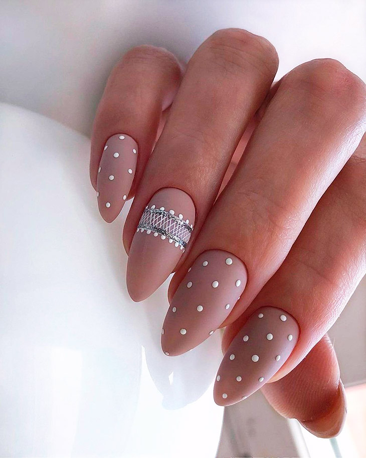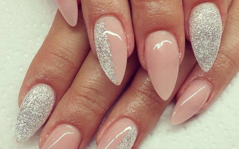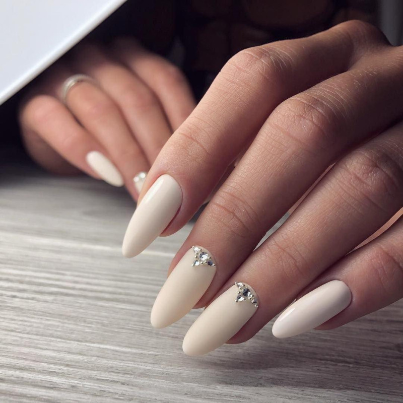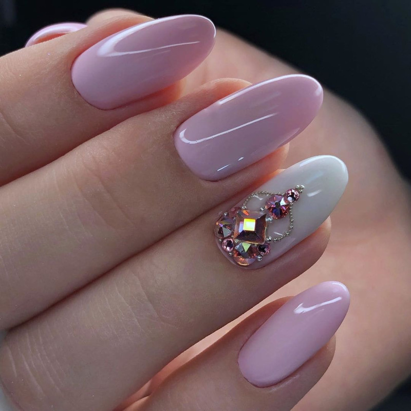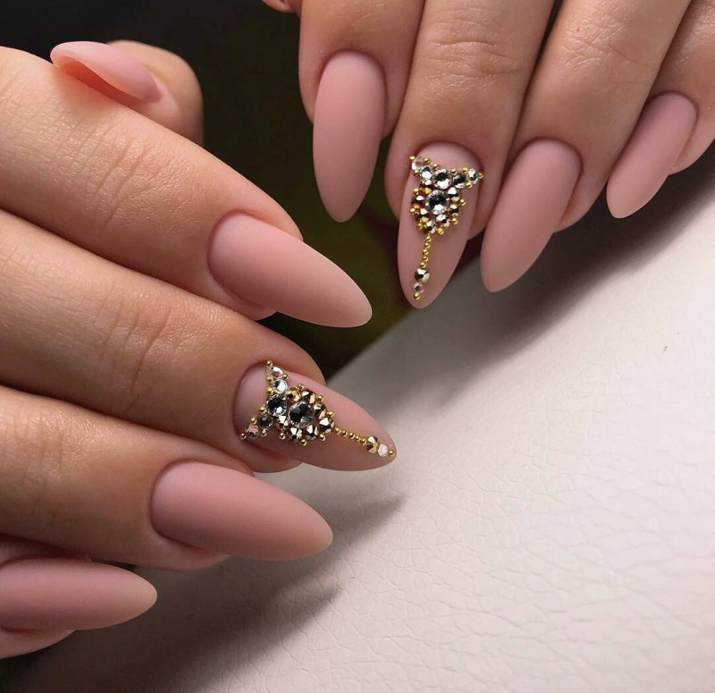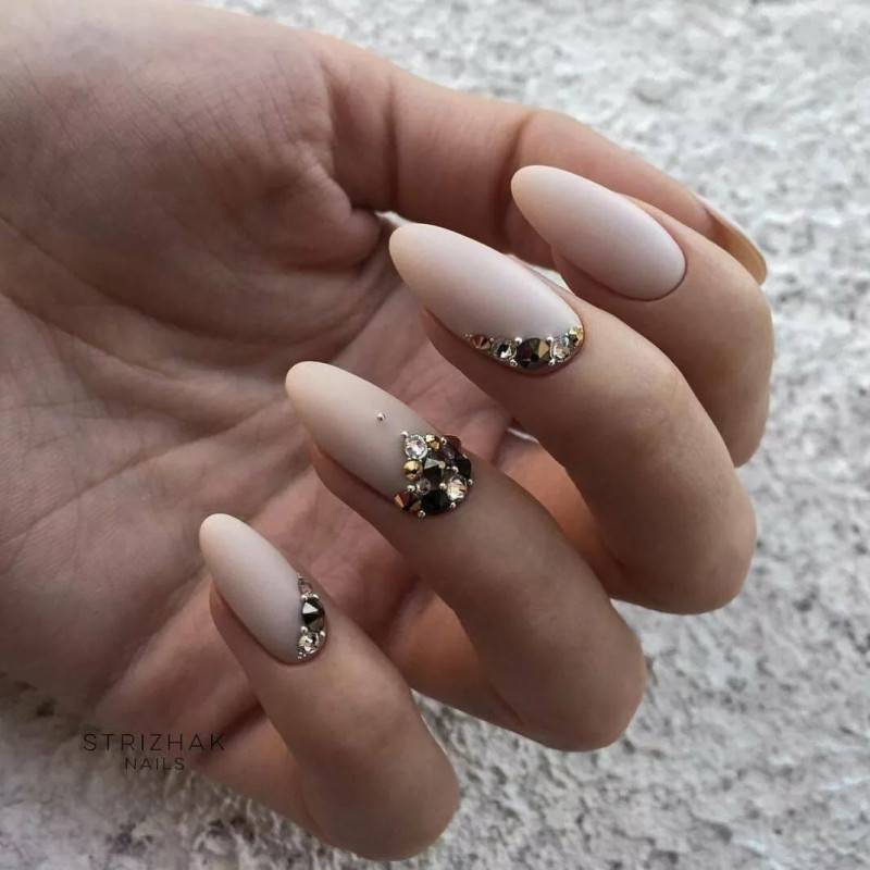 Миндальная форма ногтей – едва ли не лучший выбор в 2020 году. Она смотрится естественно и элегантно. А наличии рисунка на однотонном покрытии лишь украшает и без того прекрасный маникюр. Россыпь страз и блесток – идеальный вариант декора, с помощью которого всегда можно добавить яркости любому оформлению.