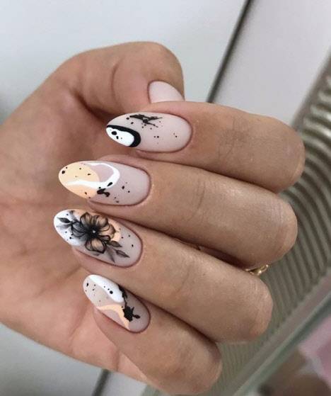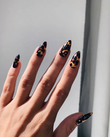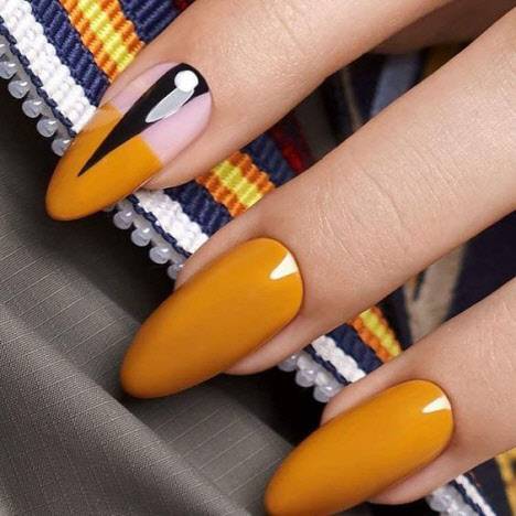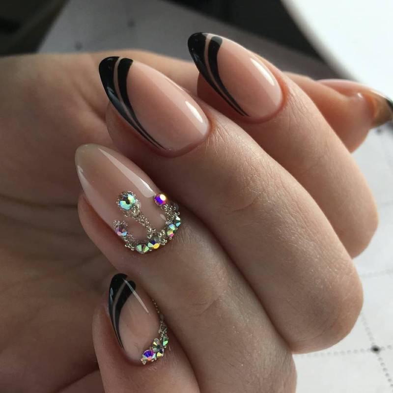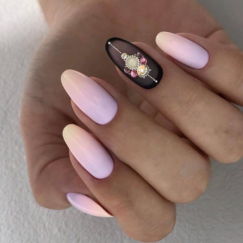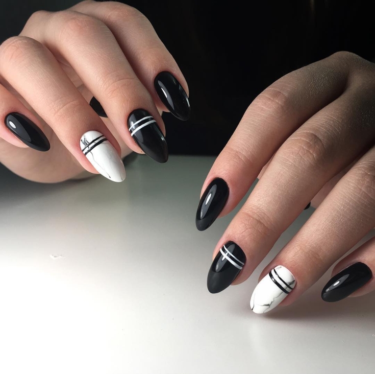 Черный- несомненный фаворит в создании маникюра 2019 миндалевидной формы. Его можно использовать как базу или сделать акцент на светлом фоне.
