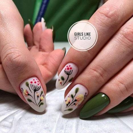 Как мы уже упоминали, отличным решением станут короткие миндалевидные ноготки, дизайн которых может быть самым искусным и разнообразным.