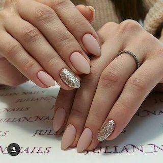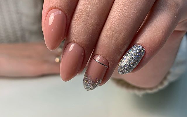 Идеальным дополнением миндального маникюра с геометрией станет серебряный или золотой глиттер. Причем золотой декор может присутствовать в повседневных образах. Дело в том, что миндальный и золотой цвет визуально схожи по колористике и идеально гармонируют в одном нейл-арте. Используйте глиттер для однотонного покрытия 1-2 ноготков на руке, например, безымянного и мизинца.