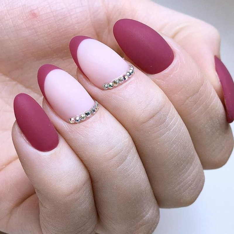 И все же мастера нейл-арта оставляют в приоритете сочетания красного и нюдового (либо розового лаков). При этом можно встретить маникюр миндаль в технике френч, выполненный следующим образом: все ноготки раскрашены прозрачным и красным лаками, один содержит рисунок на нюдовом фоне, например, горизонтальные полоски, 3 горошинки, или треугольник из страз.