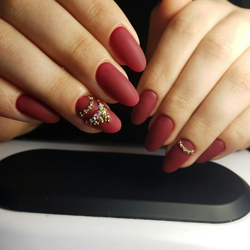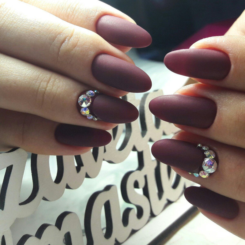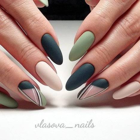Темных оттенков в маникюре особенно хочется, когда наступает холодное время года – осень. Возникает желание уюта и спокойствия, мы начинаем окружать себя уютными вещами и аксессуарами. Темный маникюр отлично гармонирует с разнообразными цветами осенней природы. И, конечно, осенний маникюр можно выполнить на миндалевидные ногти. Среди популярных цветов для его создания: глубокий винный и хаки. Подойдет такой осенний нейл арт для любой длины. Темные цвета хороши и в глянцевом виде, но в матовом они выглядят особенно благородно.