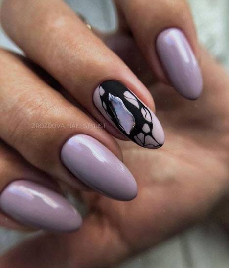Очень популярен в наступающем сезоне маникюр в технике «вуаль», когда розовый ноготок словно покрыт нежной полупрозрачной черной вуалью. Пусть таким будут один ноготь, на остальные нанесите простой французский маникюр в двух цветах: черном и розовом.