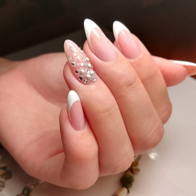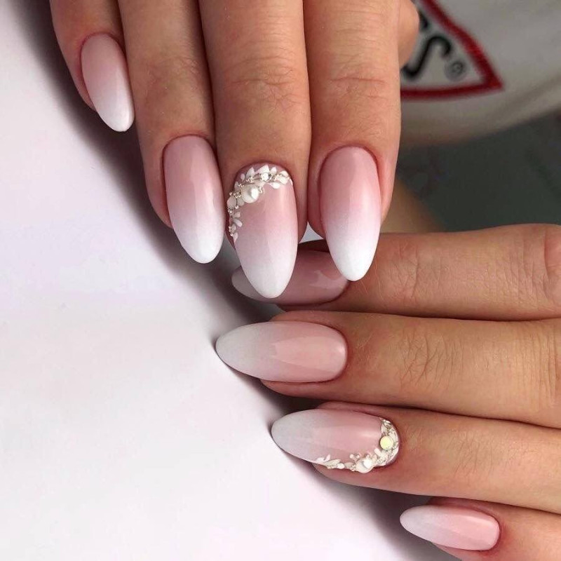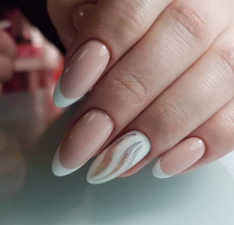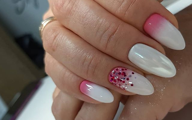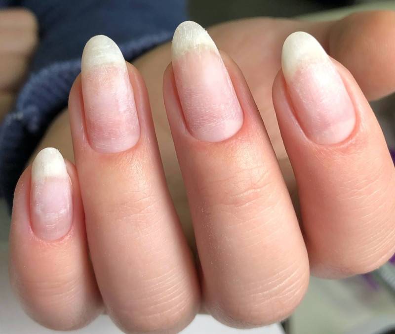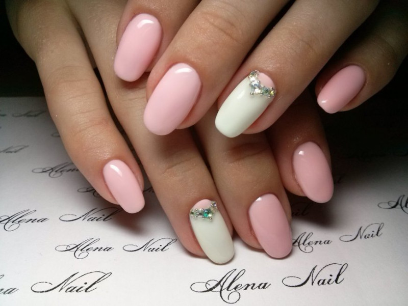 - бело-розовый миндальный маникюр, а один ноготок полностью белый;