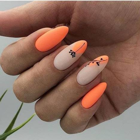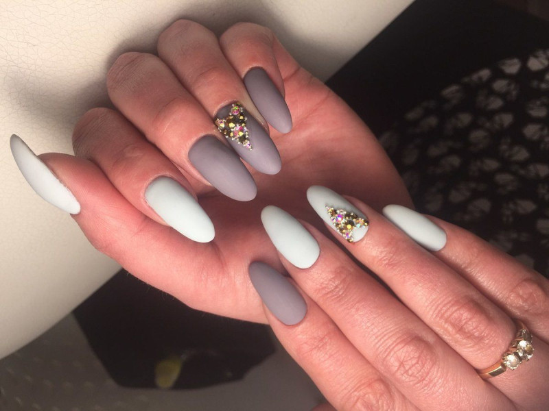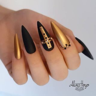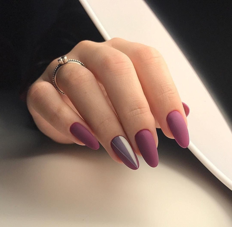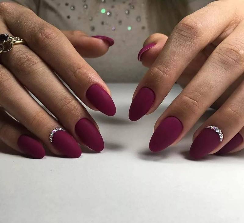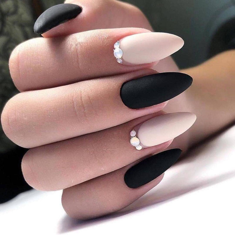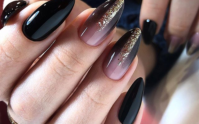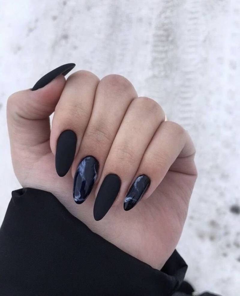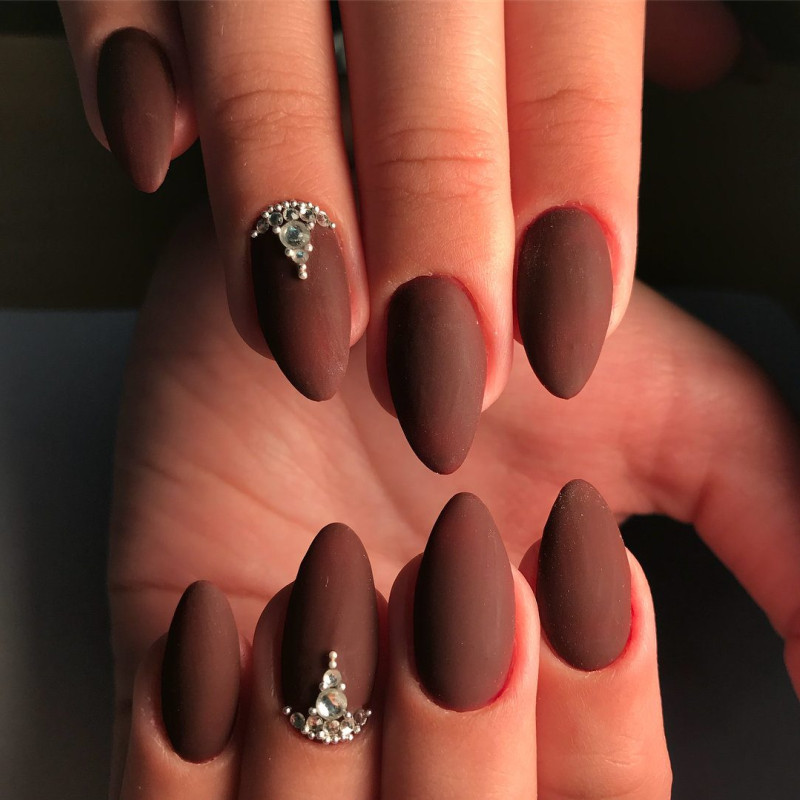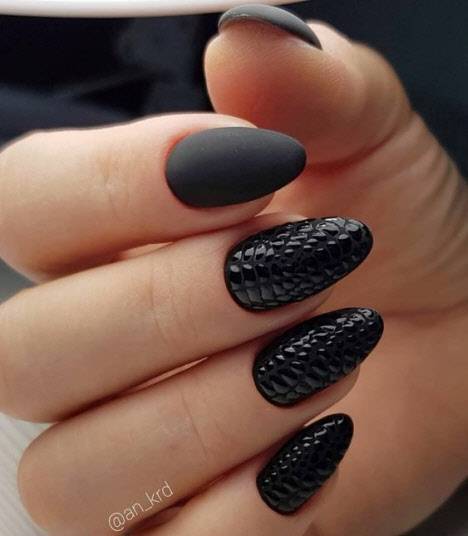 Черный цвет – противоположность белого, но тоже является ахроматом. Значит, он универсален и сочетается с разнообразными стилями, от классики до кэжуала. Черный может поддержать многие идеи маникюра. Одна такая идея заключается в создании матового покрытия на ногти миндальной формы. Это элегантный и благородный вариант нейл арта. Пластины следует накрасить черным цветом, а затем покрыть матовым топом. Красиво будет, если выделить по одному пальчику на каждой руке блестками.