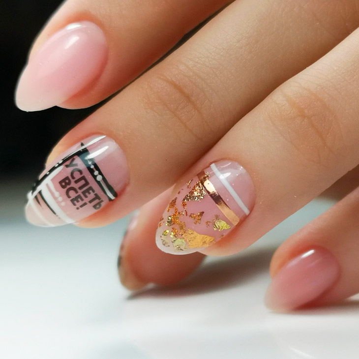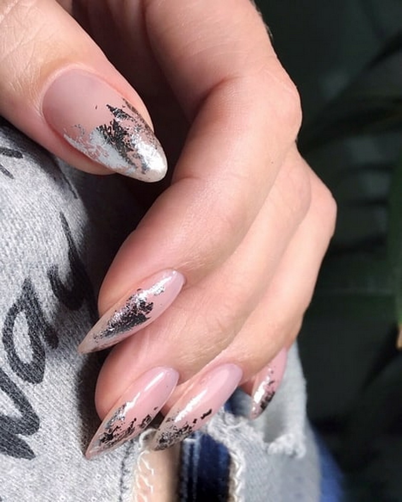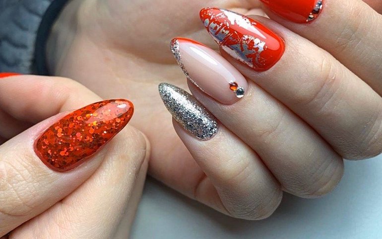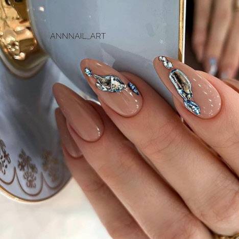 Фольга шикарно соединяется с классическим нюдом, любыми яркими тонами и даже абстракционизмом. Глиттеры, стразы и втирки также хорошо дополняют металлический слой.
