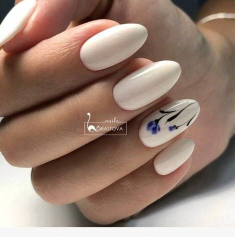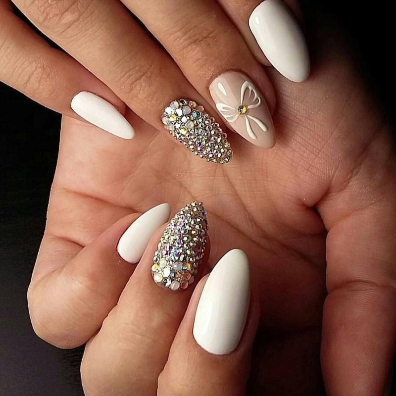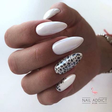 Если вы решили сделать белый дизайн ногтей, миндаль – отличная форма для его воплощения. Белые ногти миндалевидной формы прекрасны сами по себе. Но, при желании дополнительно украсить белый маникюр, действуйте! Ведь этот цвет является прекрасной основой для создания разных видов нейл арта. К тому же белый цвет используют как подложку под другие дизайны и, конечно, при выполнении френча, так что он незаменим.