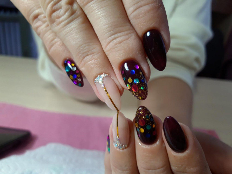 Длинные ногти являются отличной площадкой для творчества. На коротких пластинах не все желаемые задумки смогут выглядеть органично, с длинными же пластинами все иначе. Длина позволяет использовать пространство для воплощения идей. Можно создать сложный нейл арт с рисунками, блестками, инкрустацией стразами. Форма ногтей миндаль не исключение. С ней можно подружить разнообразные дизайны. Преимуществом будет хорошая носкость покрытия, так как маникюр миндаль не подразумевает острые углы (как, например, у квадрата), которыми можно зацепиться за что-либо и сломать пластину. В то же время стоит следить, чтобы пластины не перерастали и вовремя корректировать покрытие, самостоятельно или у мастера. Иначе нагрузка на стрессовую зону будет слишком большой, тогда ноготь может не выдержать и обломиться.