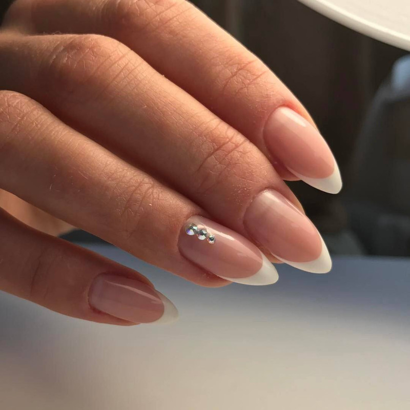 Французский маникюр на миндалевидных ногтях с дизайном и без