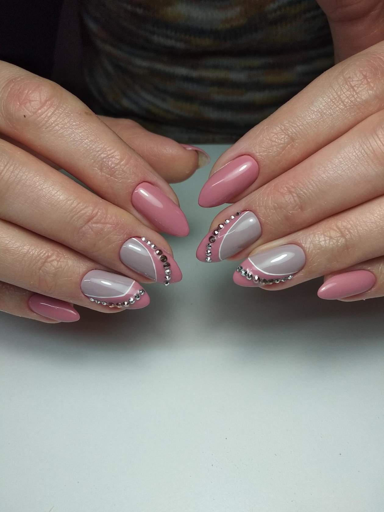 - серое с розовым сочетание на ногтях миндалевидной формы;