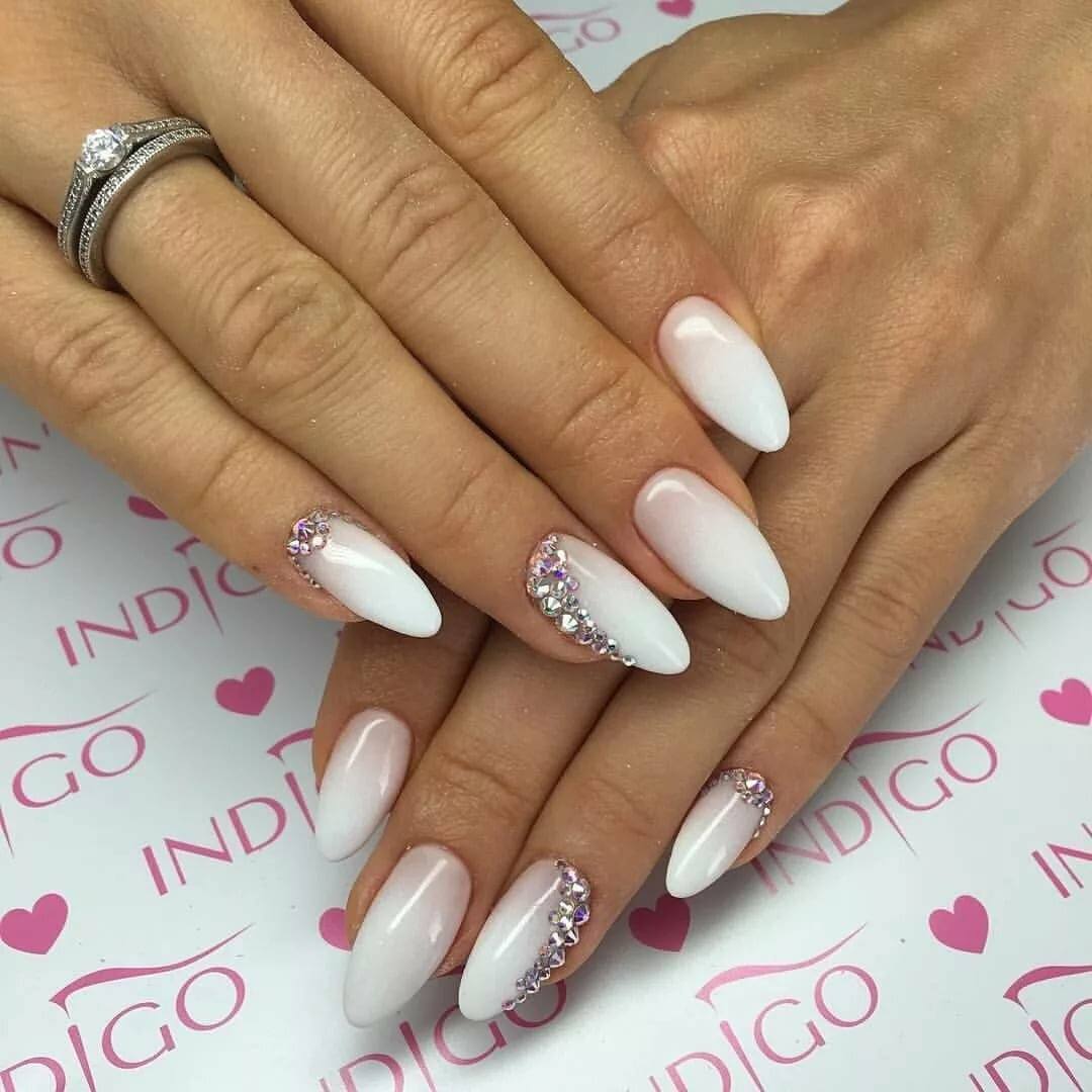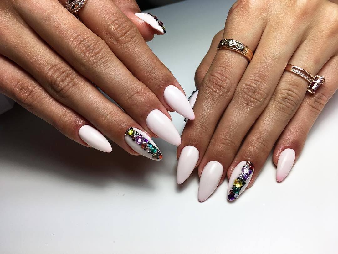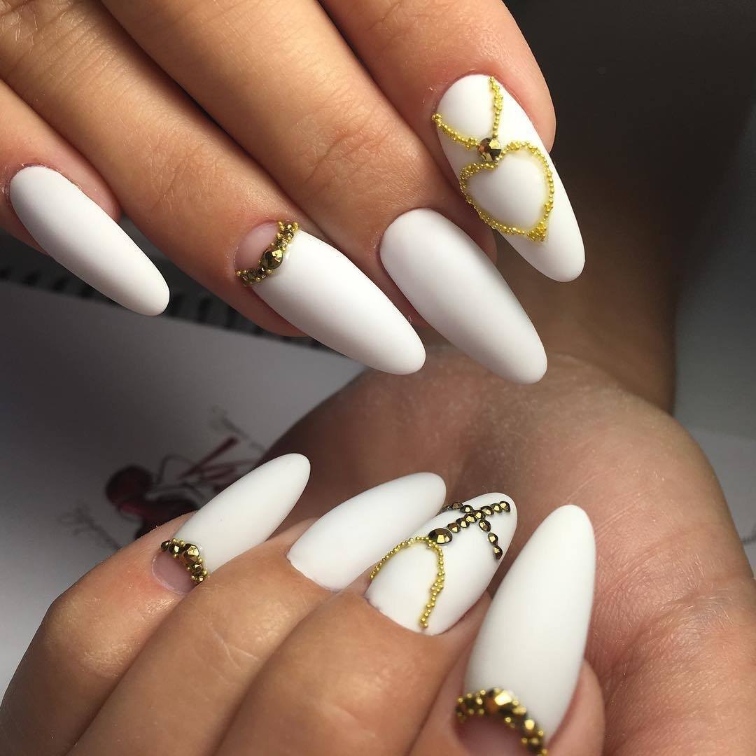 Если вы решили сделать белый дизайн ногтей, миндаль – отличная форма для его воплощения. Белые ногти миндалевидной формы прекрасны сами по себе. Но, при желании дополнительно украсить белый маникюр, действуйте! Ведь этот цвет является прекрасной основой для создания разных видов нейл арта. К тому же белый цвет используют как подложку под другие дизайны и, конечно, при выполнении френча, так что он незаменим.