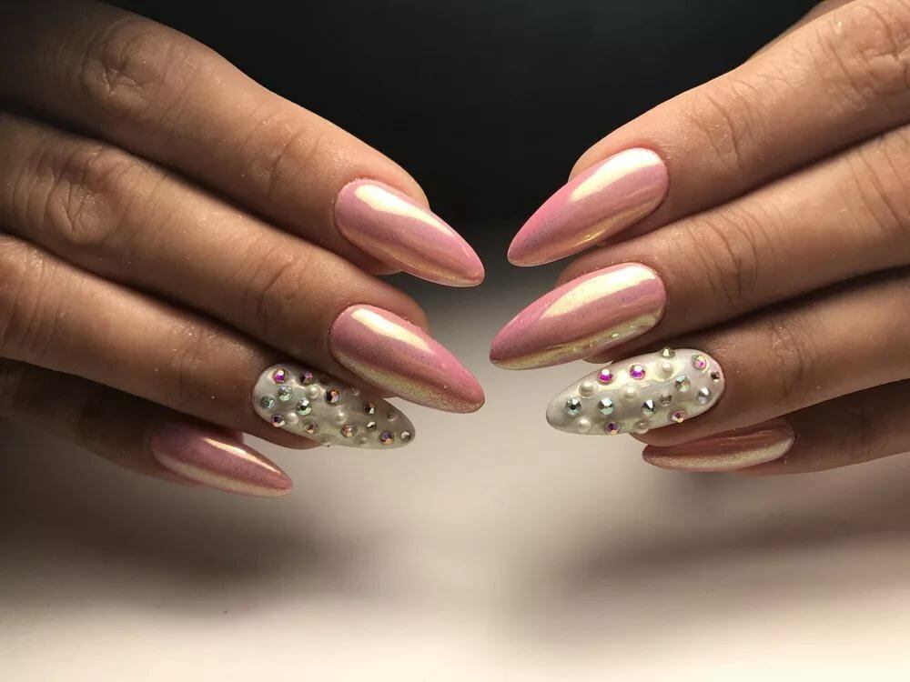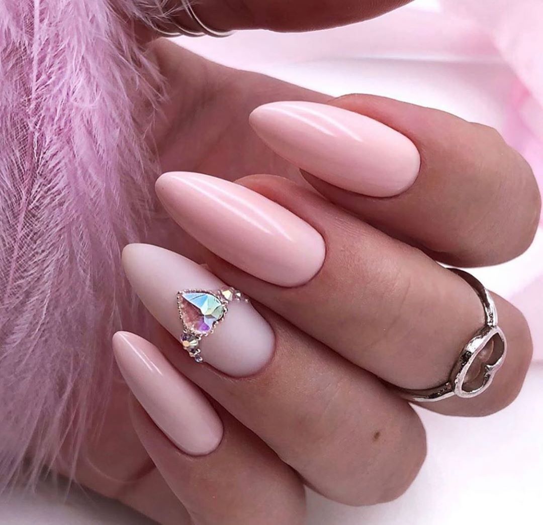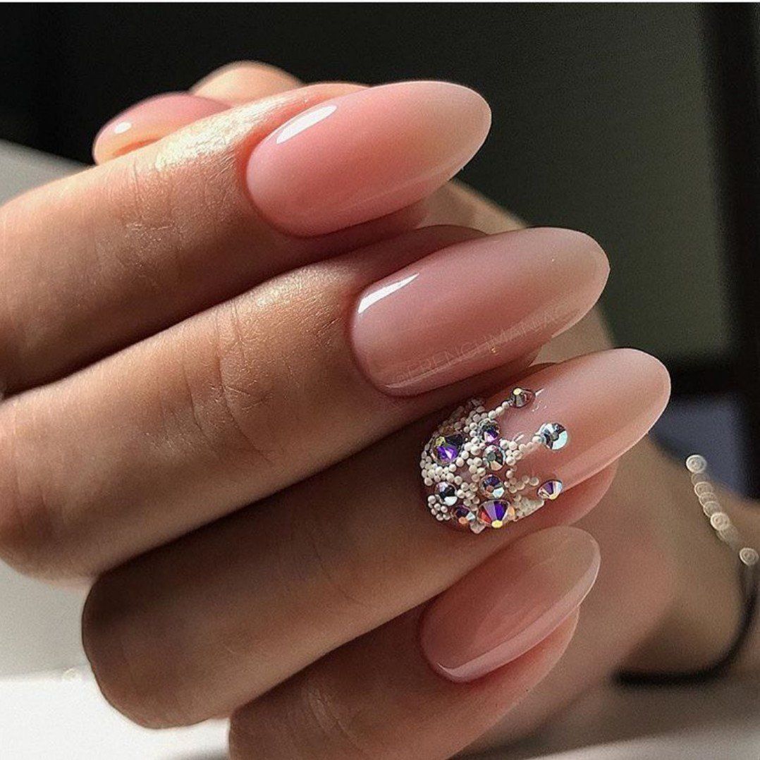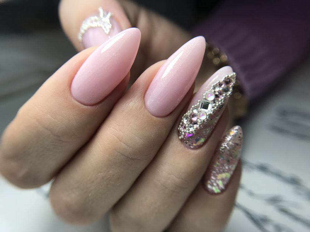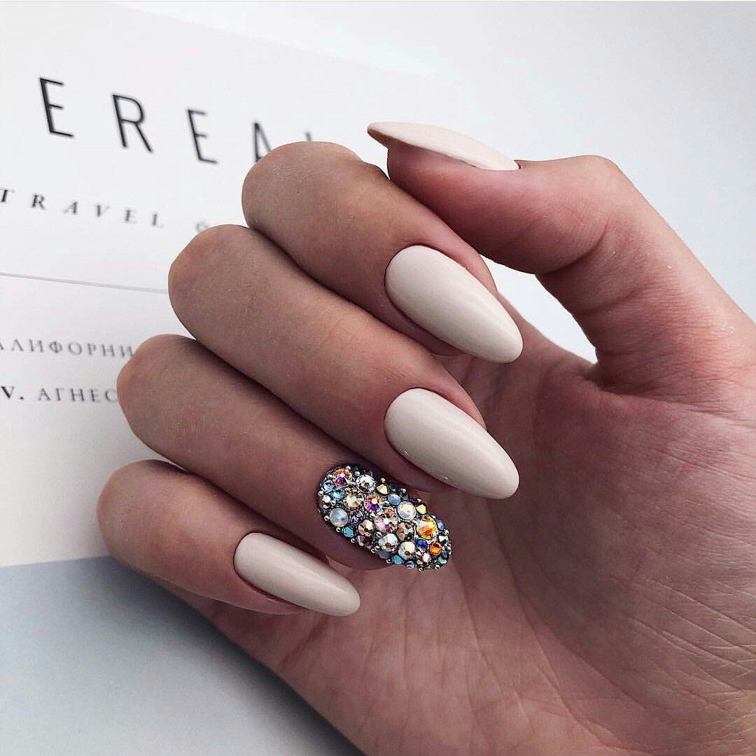 Миндальная форма ногтей – едва ли не лучший выбор в 2020 году. Она смотрится естественно и элегантно. А наличии рисунка на однотонном покрытии лишь украшает и без того прекрасный маникюр. Россыпь страз и блесток – идеальный вариант декора, с помощью которого всегда можно добавить яркости любому оформлению.
