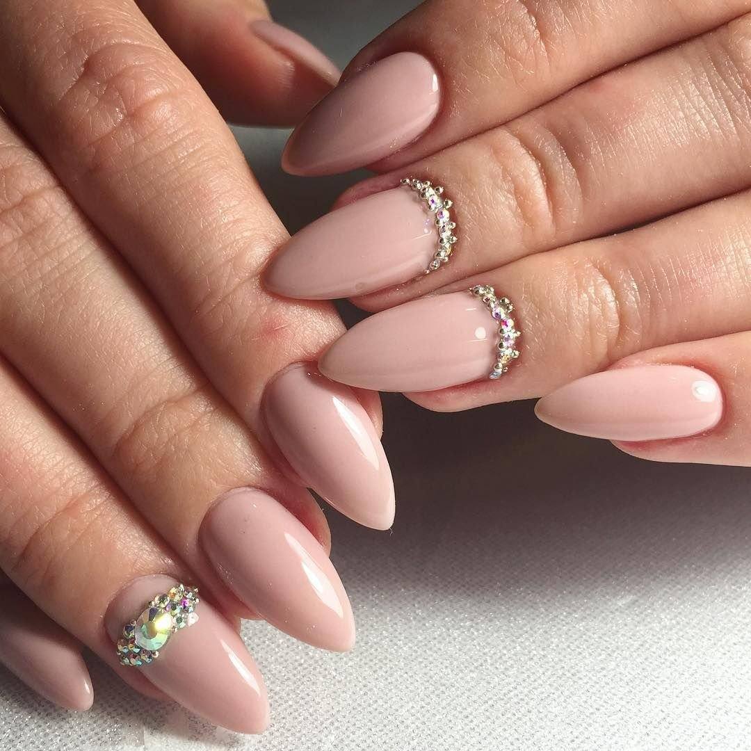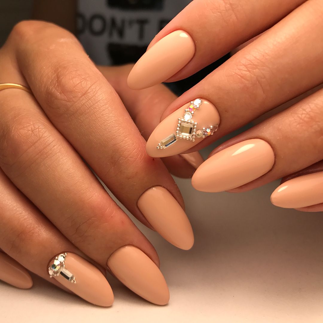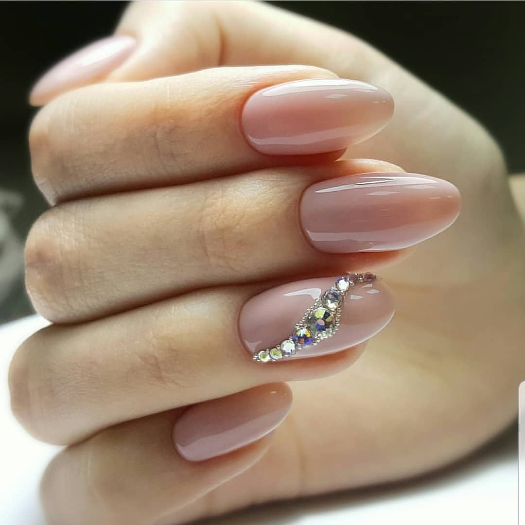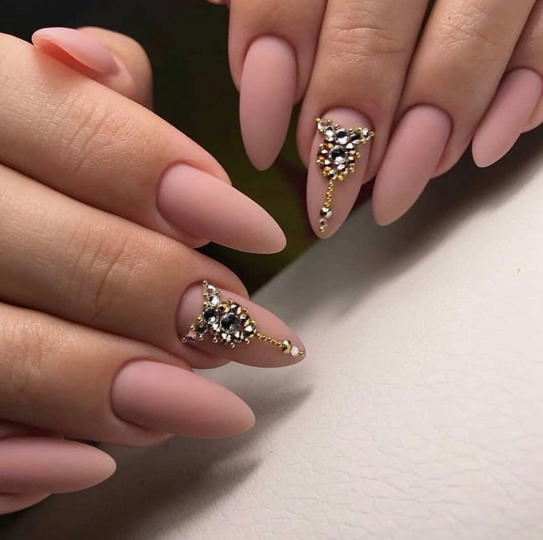 Миндальная форма ногтей – едва ли не лучший выбор в 2020 году. Она смотрится естественно и элегантно. А наличии рисунка на однотонном покрытии лишь украшает и без того прекрасный маникюр. Россыпь страз и блесток – идеальный вариант декора, с помощью которого всегда можно добавить яркости любому оформлению.