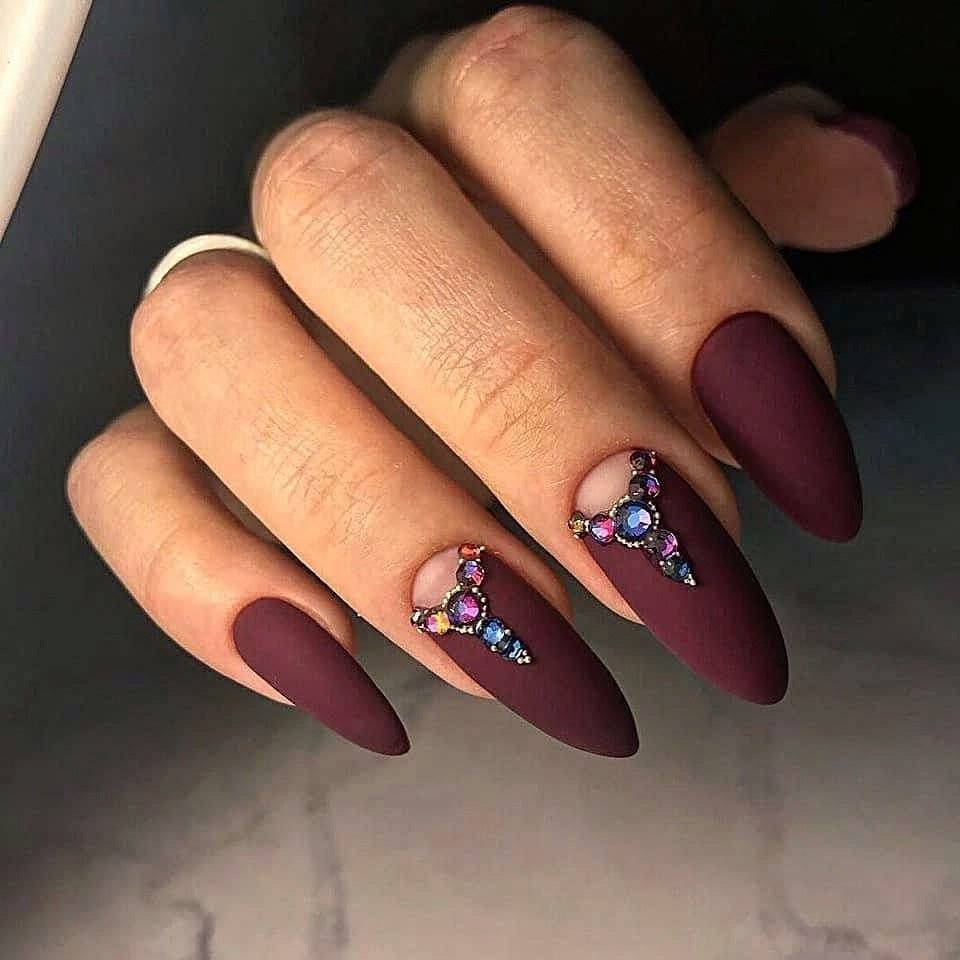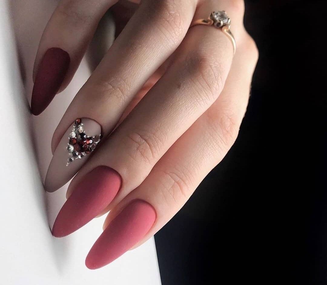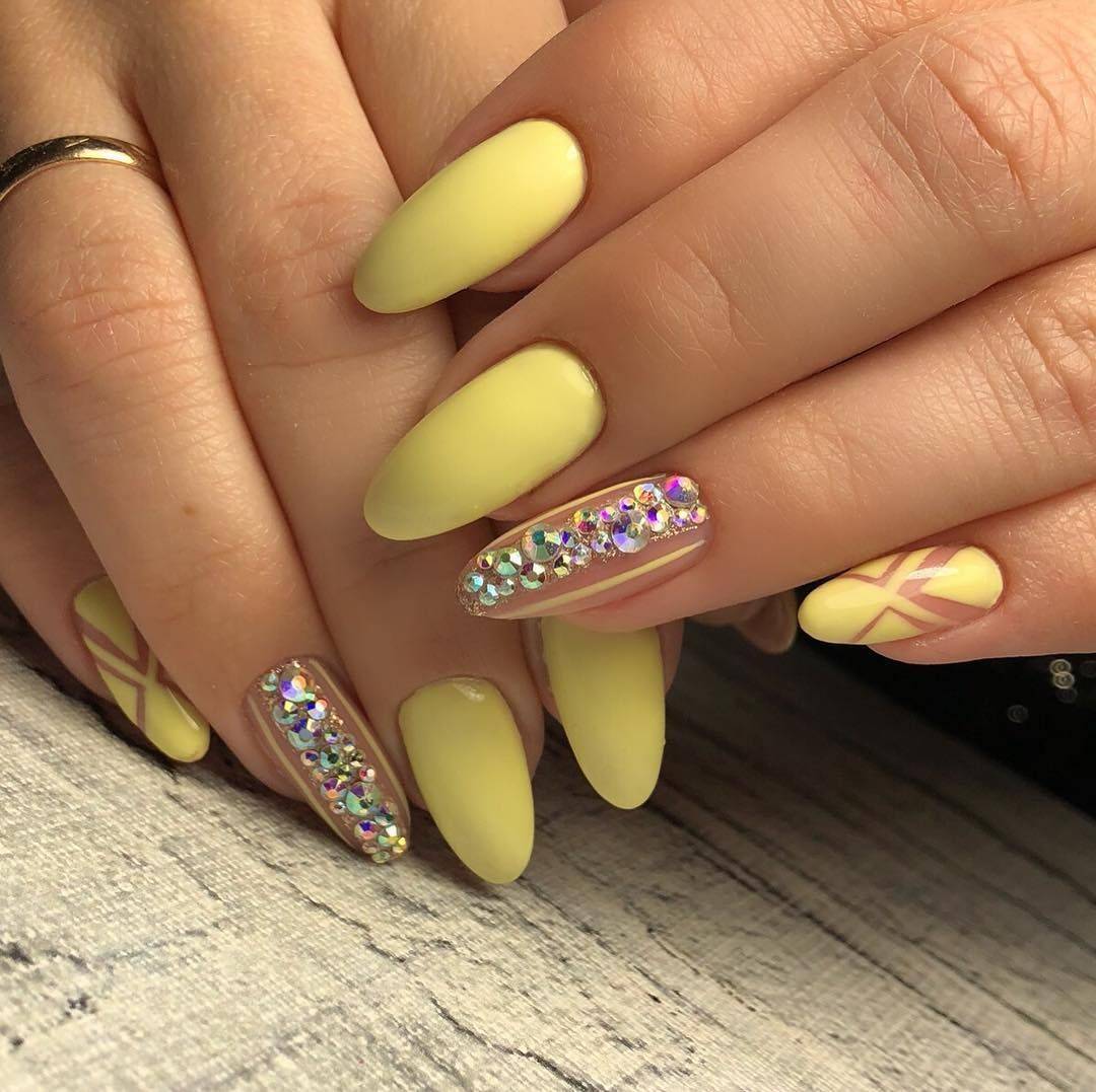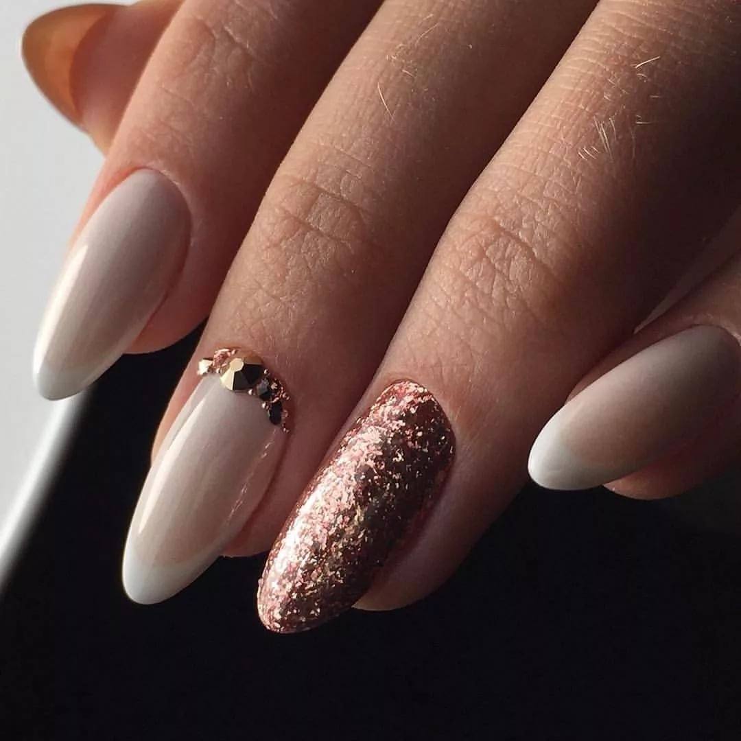 Миндальная форма ногтей – едва ли не лучший выбор в 2020 году. Она смотрится естественно и элегантно. А наличии рисунка на однотонном покрытии лишь украшает и без того прекрасный маникюр. Россыпь страз и блесток – идеальный вариант декора, с помощью которого всегда можно добавить яркости любому оформлению.
