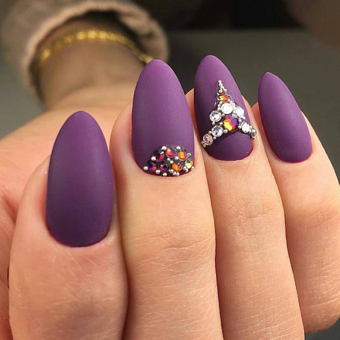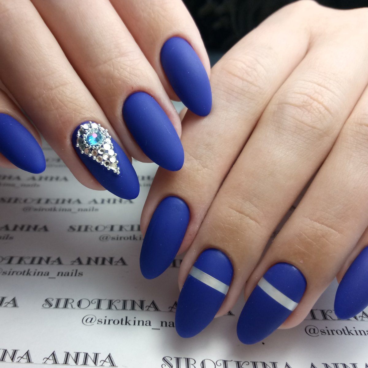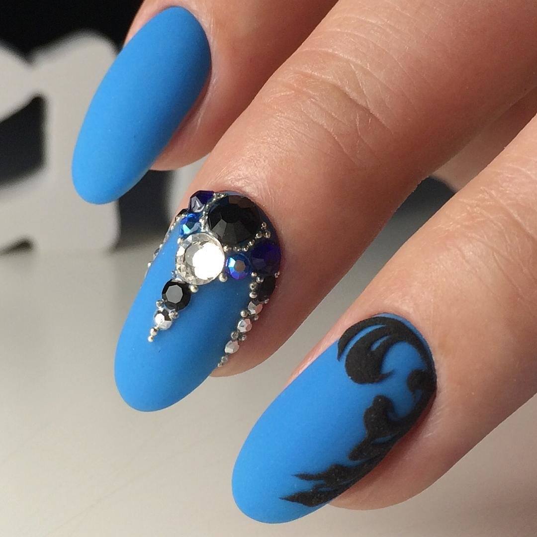 Черный цвет – противоположность белого, но тоже является ахроматом. Значит, он универсален и сочетается с разнообразными стилями, от классики до кэжуала. Черный может поддержать многие идеи маникюра. Одна такая идея заключается в создании матового покрытия на ногти миндальной формы. Это элегантный и благородный вариант нейл арта. Пластины следует накрасить черным цветом, а затем покрыть матовым топом. Красиво будет, если выделить по одному пальчику на каждой руке блестками.