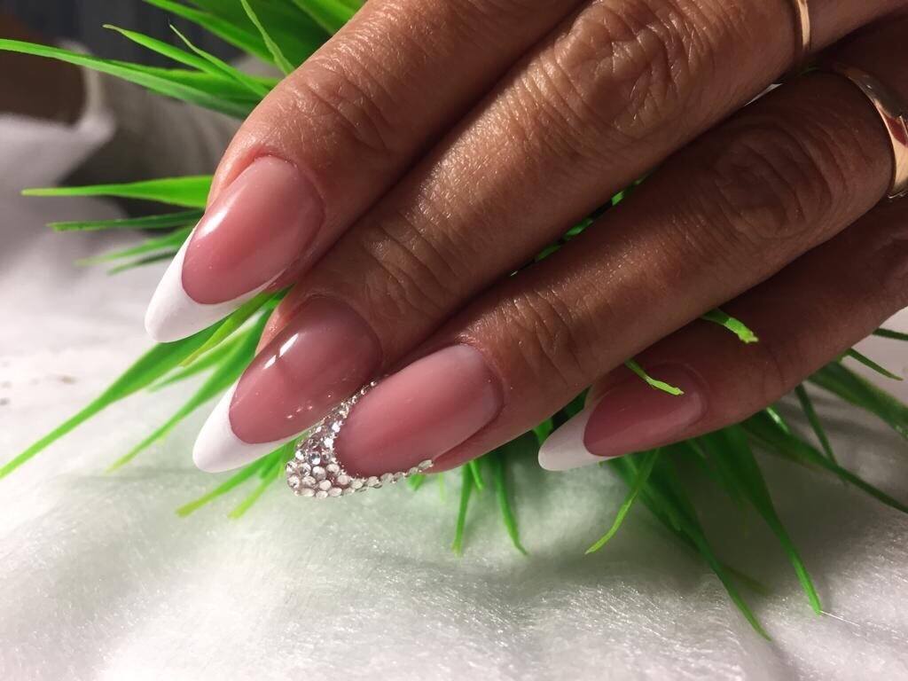 - бело-розовый миндальный маникюр, а один ноготок полностью белый;