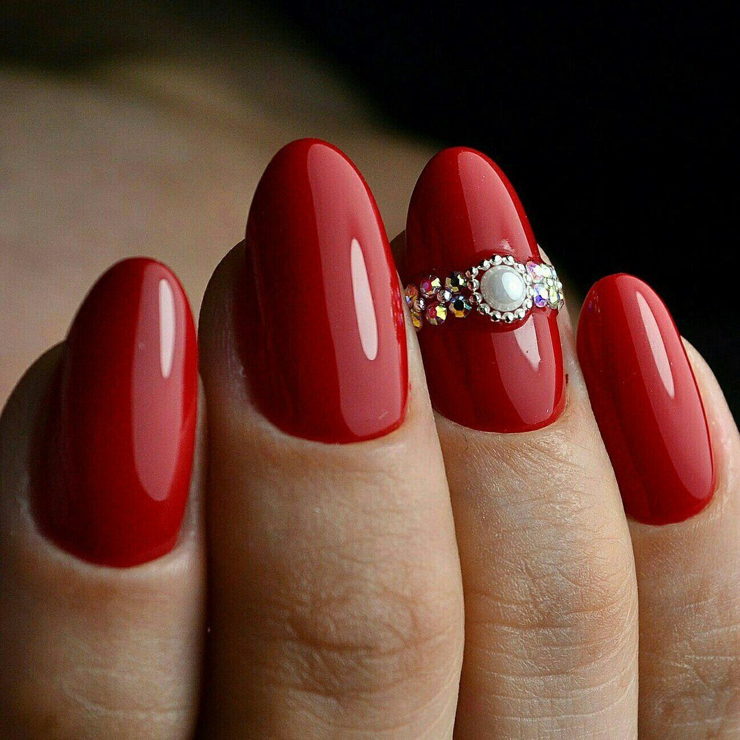 И все же мастера нейл-арта оставляют в приоритете сочетания красного и нюдового (либо розового лаков). При этом можно встретить маникюр миндаль в технике френч, выполненный следующим образом: все ноготки раскрашены прозрачным и красным лаками, один содержит рисунок на нюдовом фоне, например, горизонтальные полоски, 3 горошинки, или треугольник из страз.
