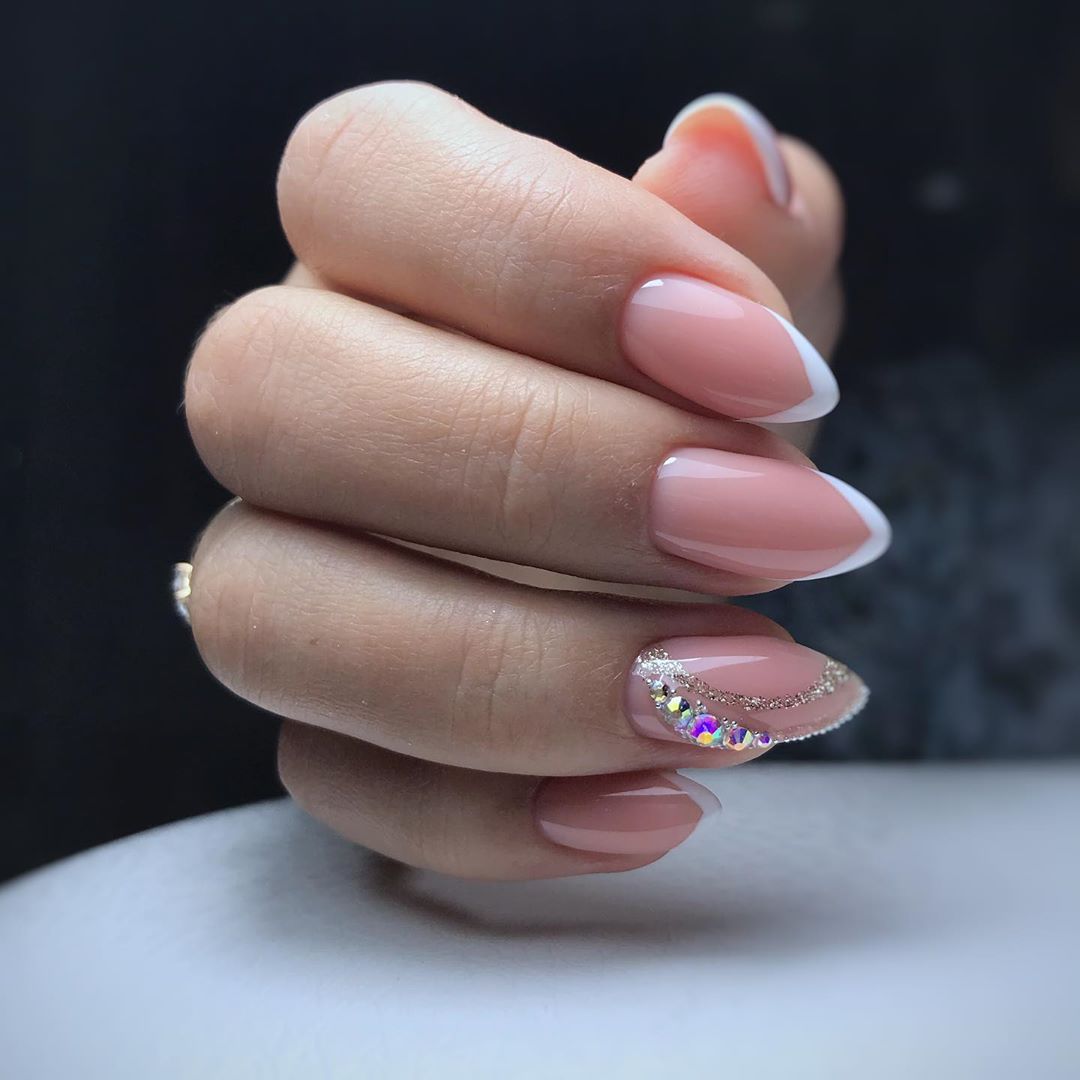 Французский маникюр на миндалевидных ногтях с дизайном и без