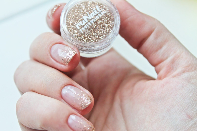 Если обычный бежевый или розовый маникюр вам надоел, добавьте немного блесток на несколько ногтей. Рекомендуется выбирать более мелкие блестки.