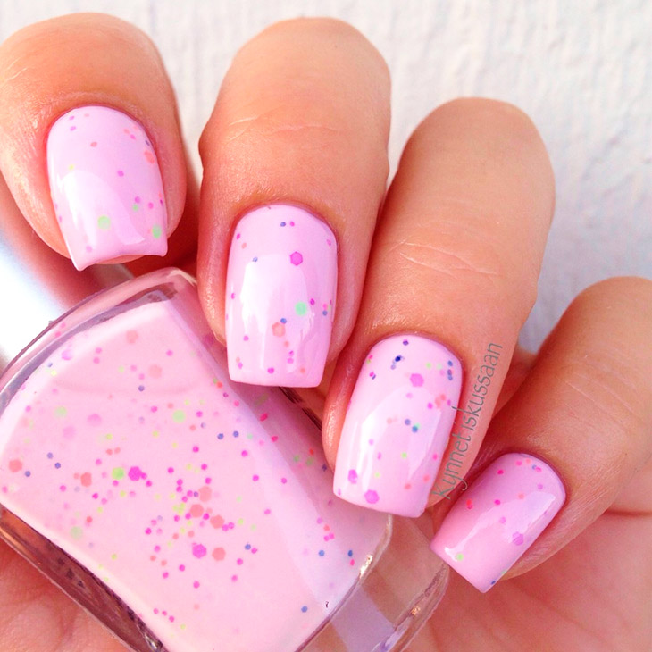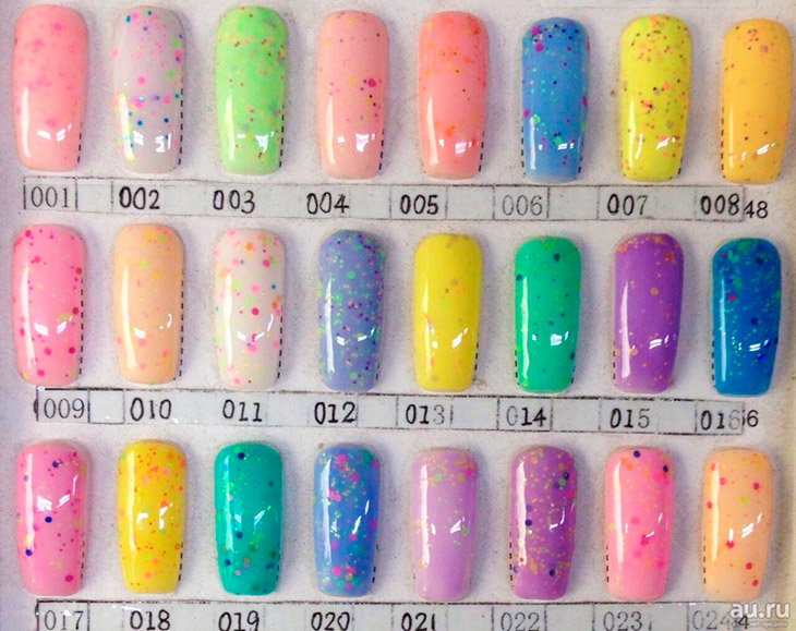 Также блестки для лака для ногтей могут входить в состав готового лака, быть в сухом виде в качестве пигмента или в жидком виде в качестве блесток.