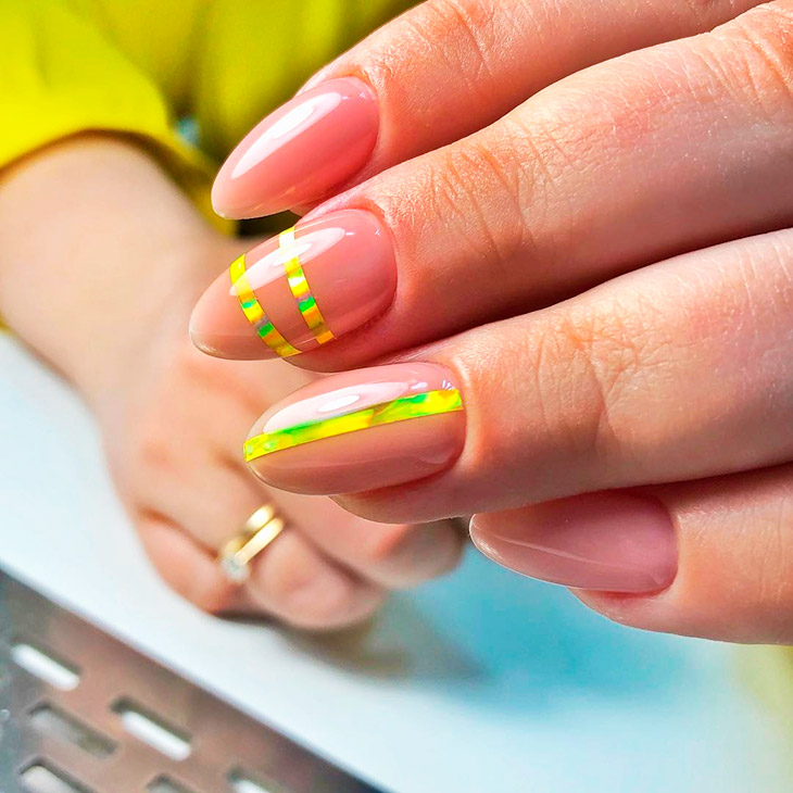 с полосками. Лак следует нанести сначала на центр ногтя вертикально, затем и на края. Нельзя трясти лак перед процессом, это спровоцирует неоднородность покрытия. Ногти покрыть надо в 2 слоя. Использовать закрепитель. Глянцевый закрепитель сделает ногти блестящими, роскошными. Если впереди ожидается праздник, свадебное мероприятие, Новый год, юбилей или что-то ещё, можно выполнить маникюр в стилевом направлении нюд с декором полосками. Дизайнов применения полосок множество. Полоски продаются в рулонах разной толщины. После их использования обязательно надо наносить топ.