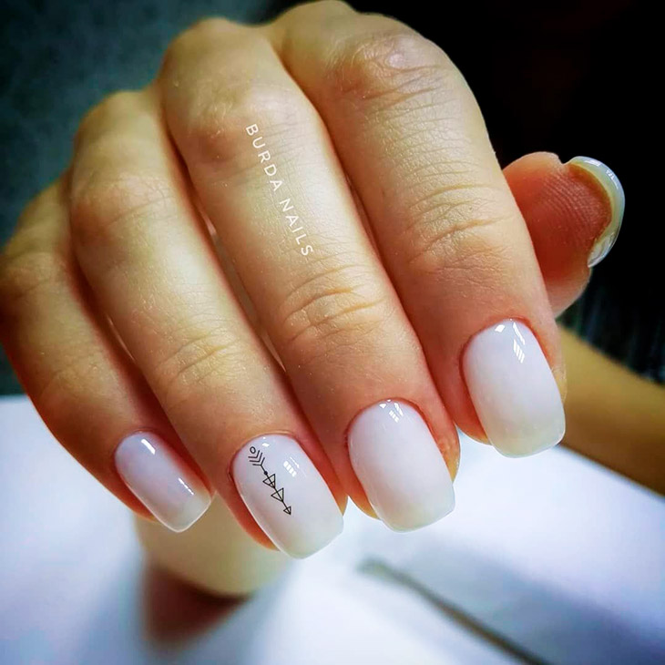 Белые нюдовые ногти смотрятся очень интересно, хотя сочетаются обычные цвета. Маникюр подходит не только для делового стиля, но и для веселой атмосферы. Молочно-белые нюды являются классикой в мире моды.