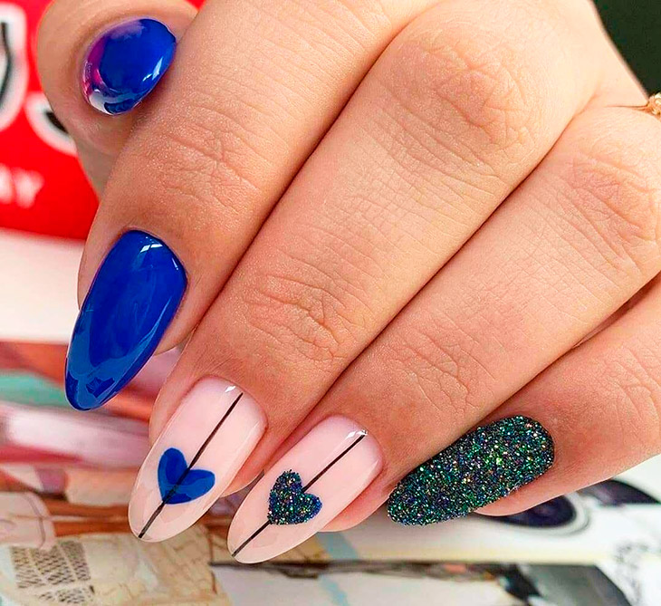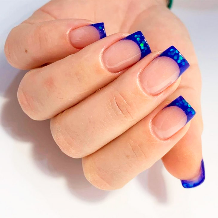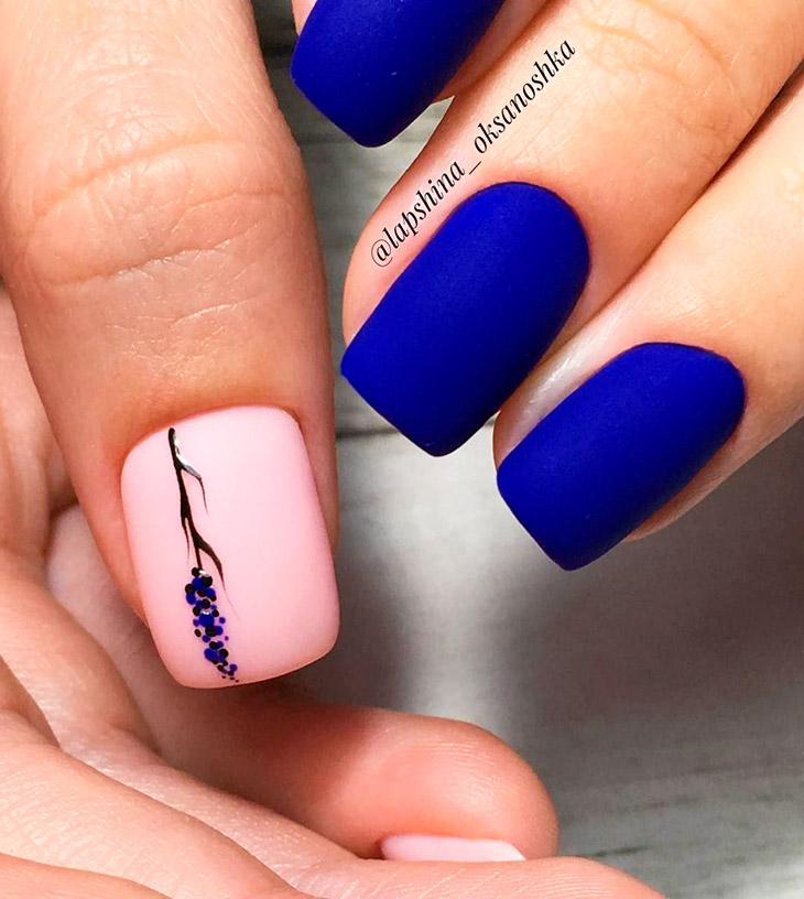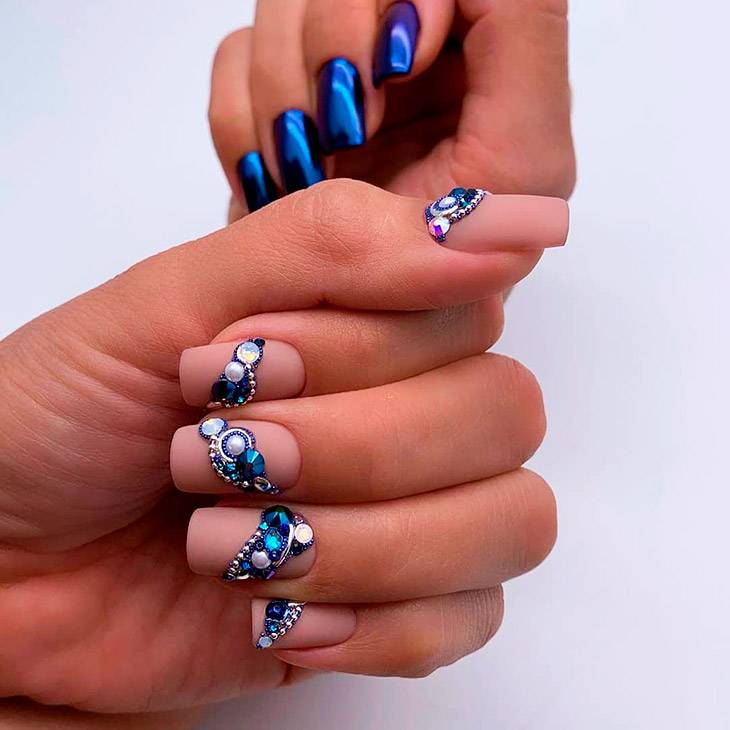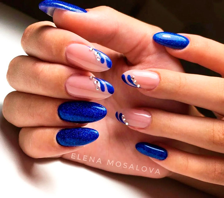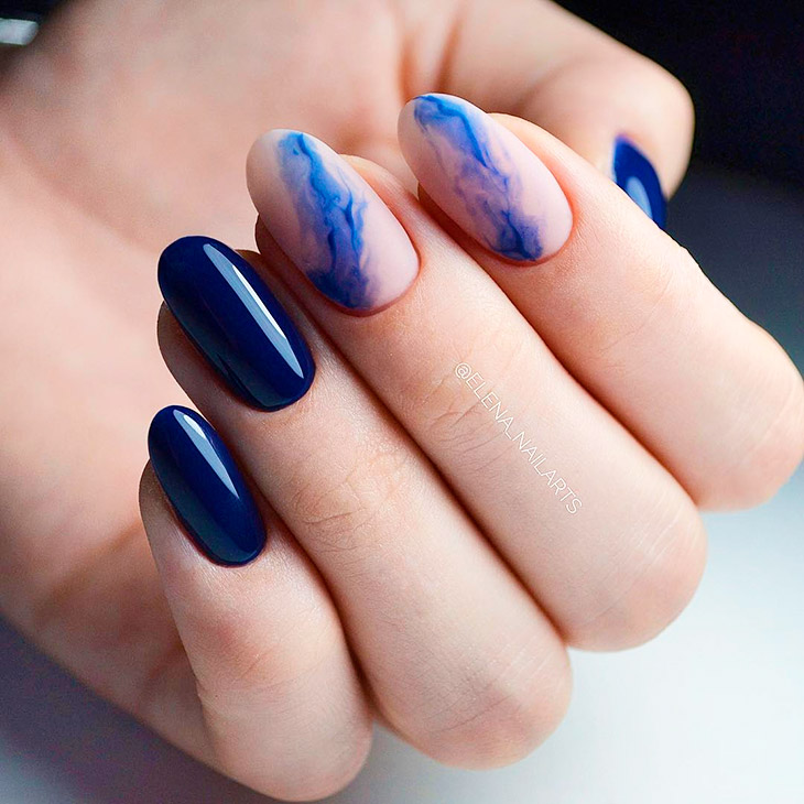 Синий отличается от других своим невероятным цветом, раскрывающим глубину и красоту естественных красок , отлично ложится на руки. Синий нюдовый маникюр подойдет на круглые, квадратные, миндалевидные и овальные ногти.
