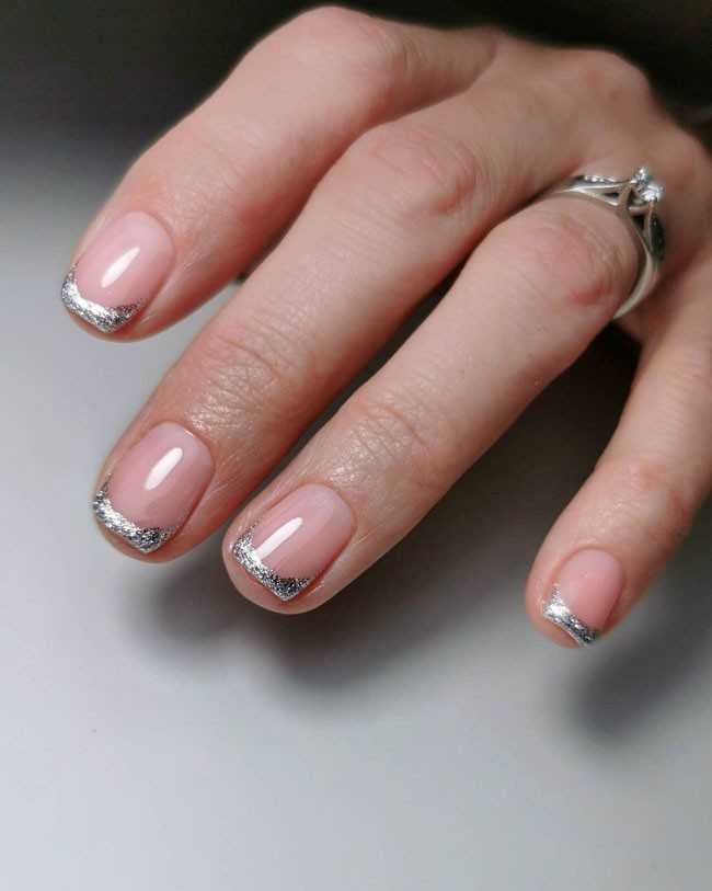 маникюр нюд с серебром. Не следует подгонять цвет лака под наряд, пусть он лучше совпадает с аксессуарами. Необходимо стандартным способом подготовить руки – удалить лишнюю кожицу и заусенцы, обезжирить ногти. Сразу после подготовки можно наносить лак, обязательно в 2 слоя. Если не сделать покрытие двухслойным, лак быстро сотрется. После того, как ногти накрашены, наносится закрепитель, выполняется просушка. Серебро и золото в ногтевом дизайне сегодня в моде. Серебро может быть представлено в виде пайеток, наклеек, объемного декора. Отлично смотрятся серебряные блестки и втирки. Можно использовать специальные аппликации и лак под серебро для декора 1-2 ногтей, остальные оставить натуральными;