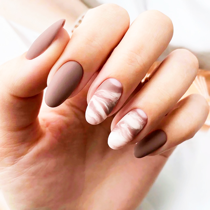 Маникюр в нюдово-коричневых тонах – лучшее решение для повседневного дизайна ногтей. Коричневый выглядит более естественным и считается цветом, который привлекает мужчин.