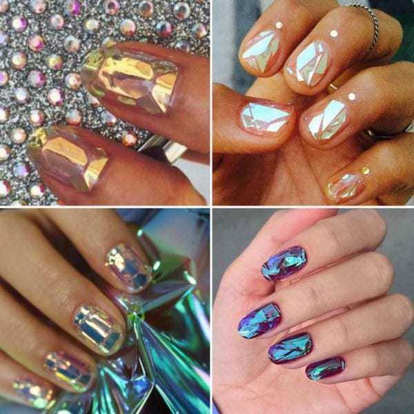 “Битое стекло”. Маникюр, имитирующий блеск разбитых стеклышек на ногтях, выглядит очень необычно. Создается такой дизайн с помощью специальной фольги. Кусочки выкладываются на уже подготовленную цветную подложку в хаотичном порядке.