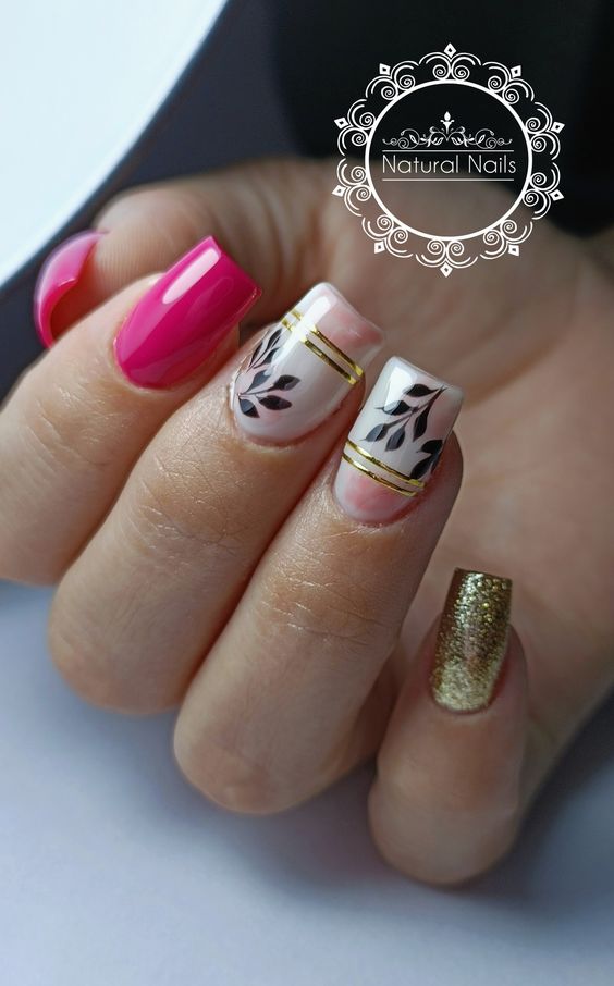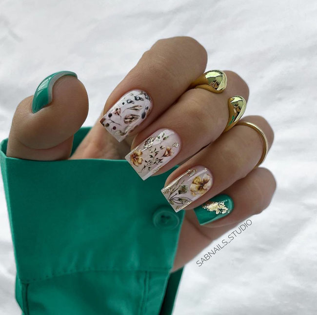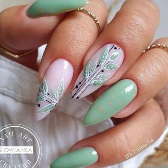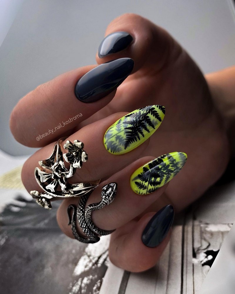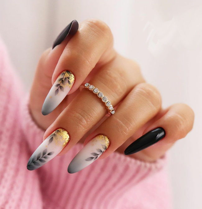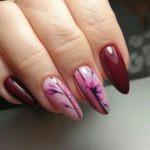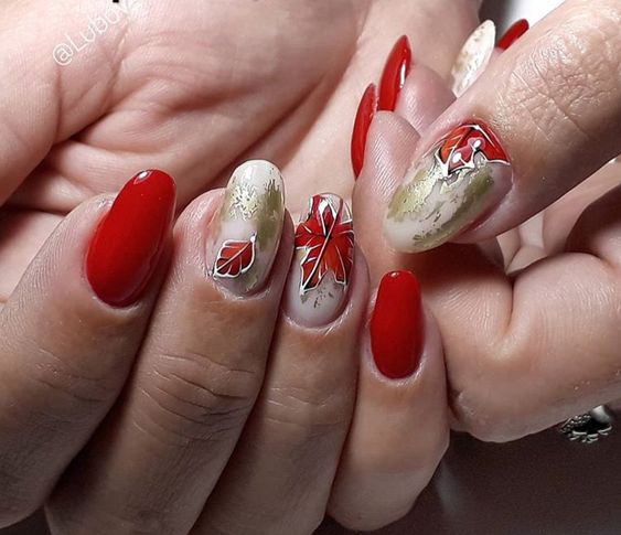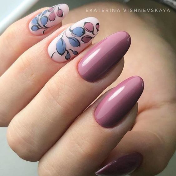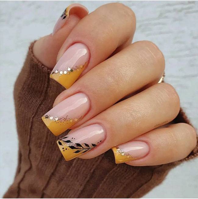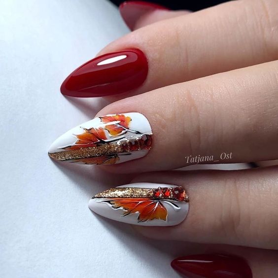 Роспись, а также имитация художественных узоров, вроде стемпинга или слайдер-наклеек не выходят из моды. Для осени стоит выбирать растительные узоры, в том числе: