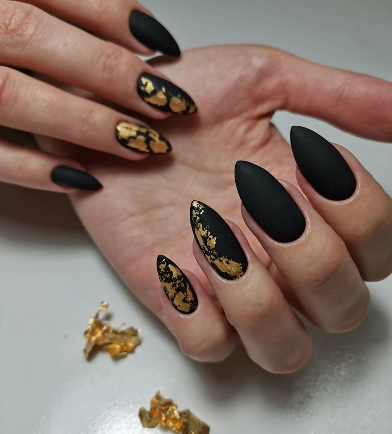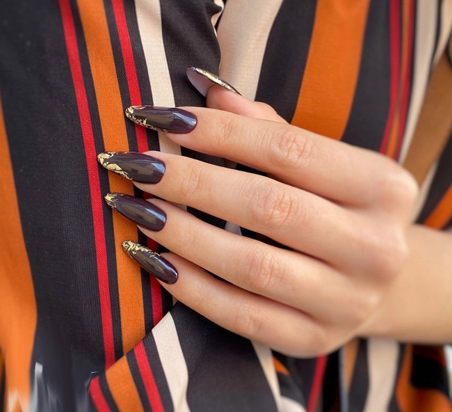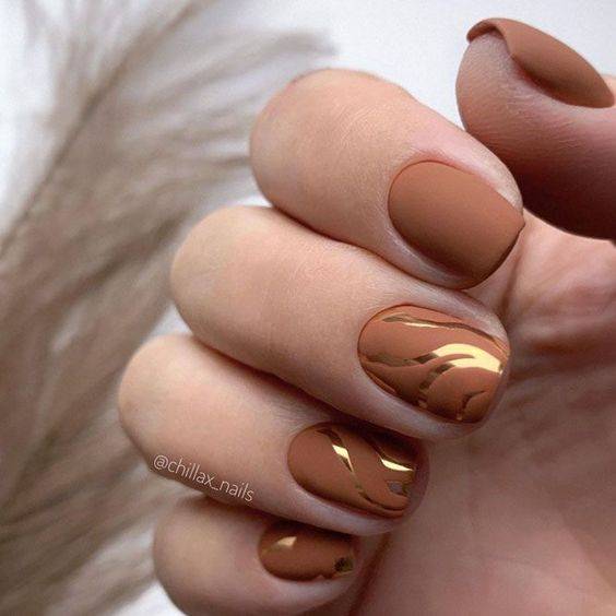 На период золотой осени предлагается сообразить на ногтях переливы золота. Наиболее выигрышно смотрится тандем золотого блеска с матовыми бархатными оттенками на базу покрытия ногтя. Блеск можно создать при помощи стразов, глиттера или золотой фольги. Для смелых можно совместить такой нейл-арт с негативным пространством.