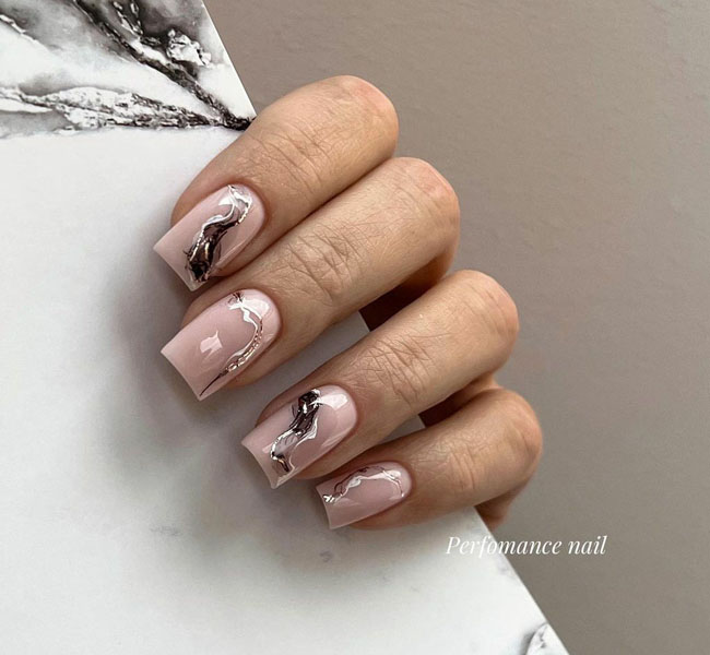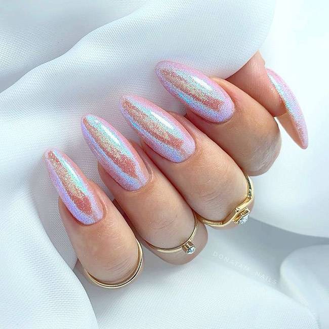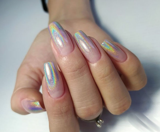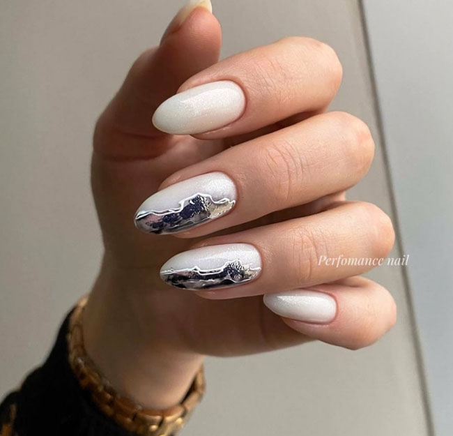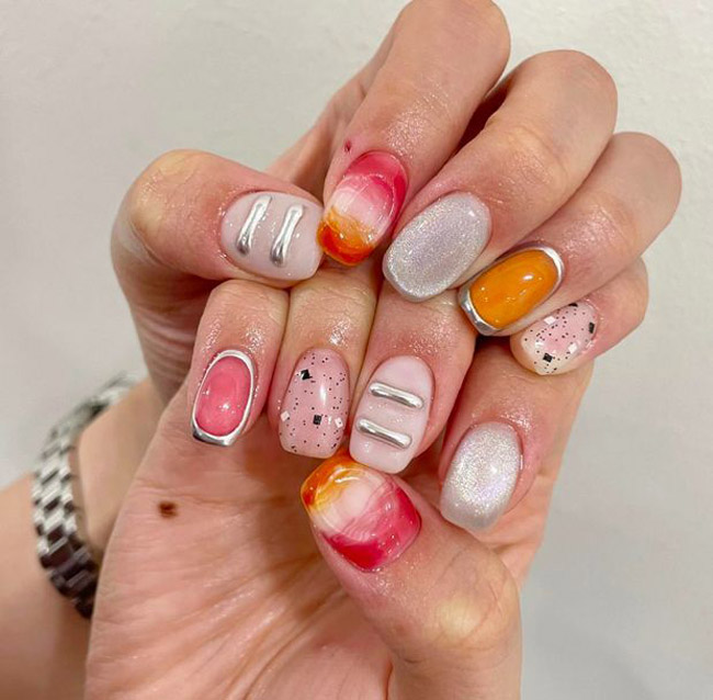 Для тех, кто любит дизайн с блеском, хромовые тона станут одним из идеальных вариантов маникюра на осень этого года. Они, в отличие от традиционных металлических вариантов, имеют гораздо более блестящий слой, похожий на гладкое зеркало, или с блестками, которые смешивают несколько цветов для создания переливающегося эффекта.