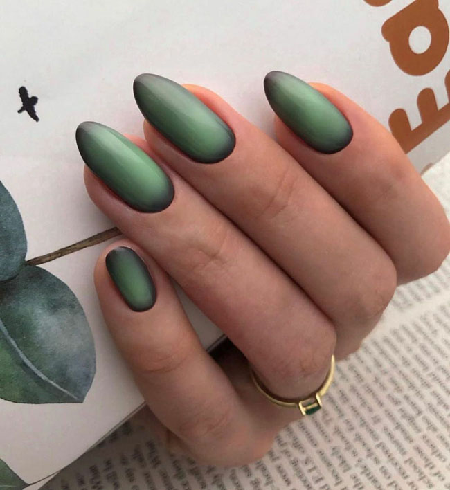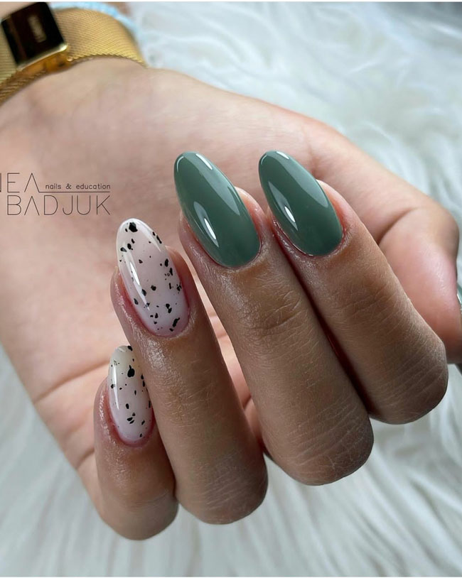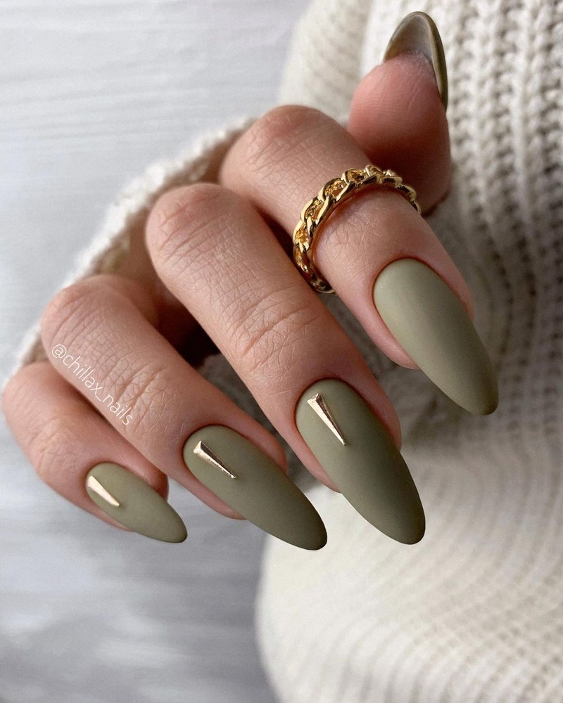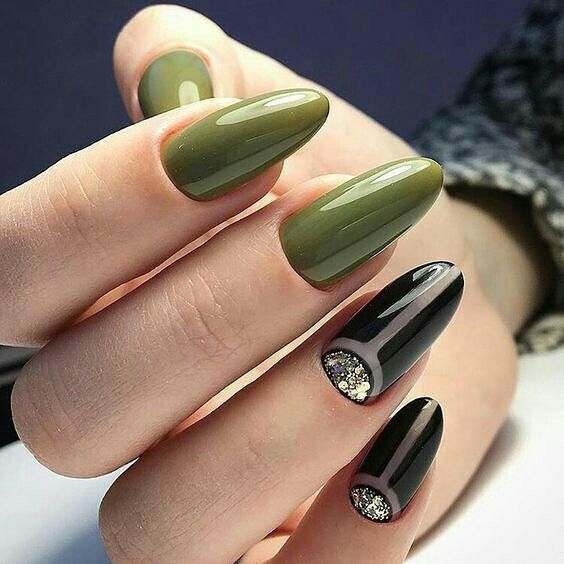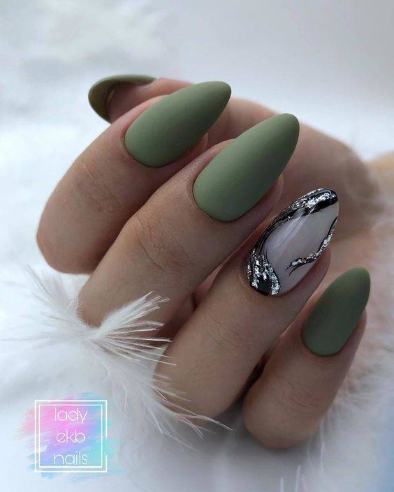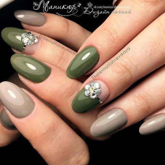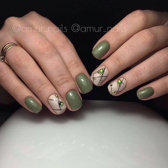 Одна из цветовых новинок маникюра на осень – мягкий, лаконичный и очень респектабельный оливковый тон. Яркие краски зелени уже не используются, а умеренные и уютные вполне допустимы. Главное, чтобы выбранный тон безупречно подходил к оттенку кожи, не делал ее бледной или болезненной. В монохроме или простой композиции олива смотрится великолепно.