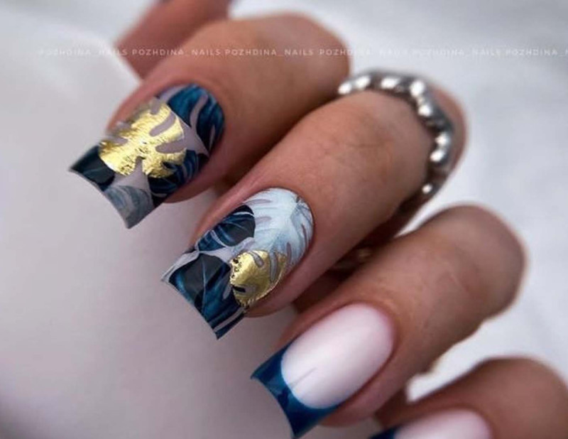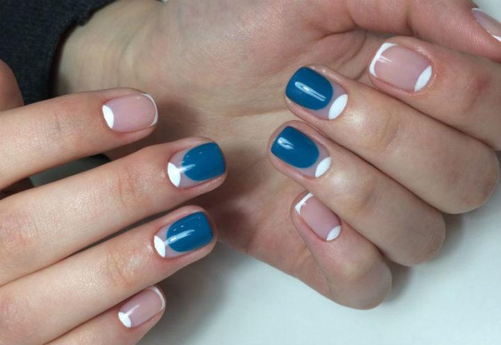 Маникюр с элементами «негативного пространства» — вариант, с которым руки точно не будут казаться скучными. Насыщенные и холодные тона одной половины ногтя прекрасно гармонируют с прозрачной половиной. Эту технику можно использовать как самостоятельный вариант, а также как дополнение к основному дизайну. Различные декоративные элементы способны разграничить ногтевую пластину на части, либо же просто лаконично дополнить общую картину.