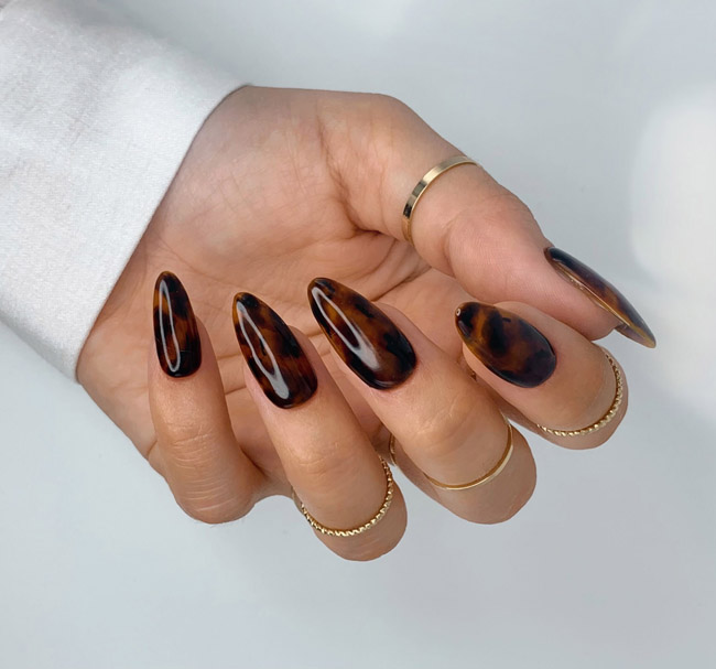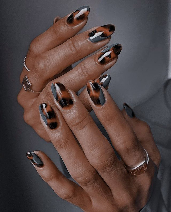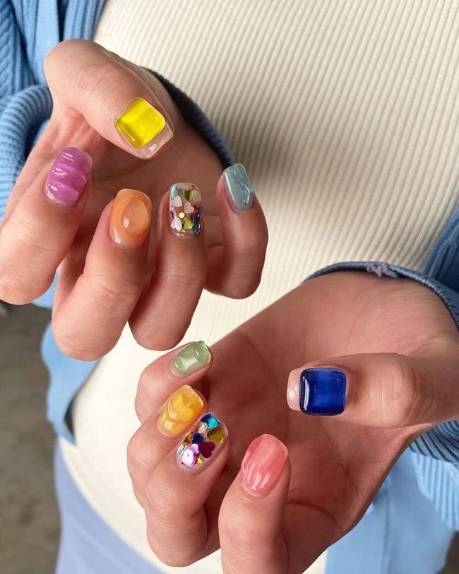 Корейские нейл-тренды постепенно доходят до этой части света и ярким примером является нейл-арт с рельефом и аппликациями фигурок сверху. Ногти с несколькими прозрачными слоями, которые создают объем, будет преобладать в этом сезоне, особенно в классических сезонных цветах, таких как коричневый и янтарный.