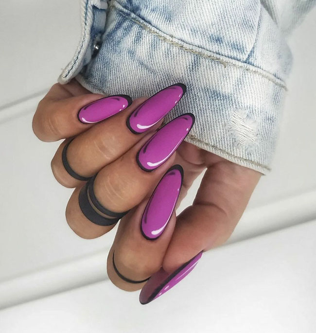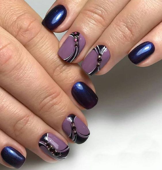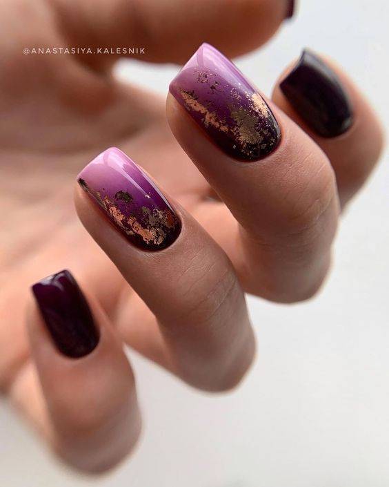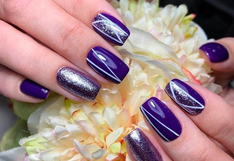 Мастера нейл-арта активно используют в композициях насыщенные оттенки фиолетового. Они роскошно смотрятся в одиночестве или тандеме со слюдой, ягодно-винными оттенками. Можно создавать самые таинственные и загадочные ансамбли, при этом сохранить респектабельный уровень. Чтобы поднять градус роскоши, стоит комбинировать с золотом, для более умеренных дуэтов – с нейтральными оттенками.