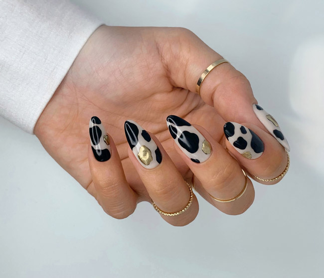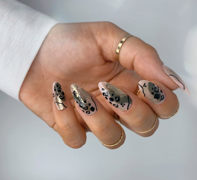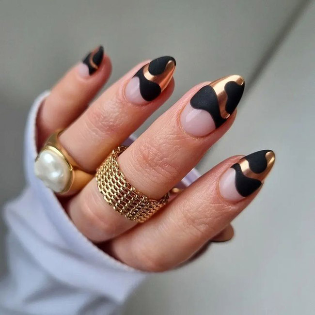 Оригинальная креативная мысль предлагает создать уникальный узор при помощи липкого слоя одной капельки и фольги. Также такой нейл-арт часто называют ртуть, жидкий металл или плавленое золото.