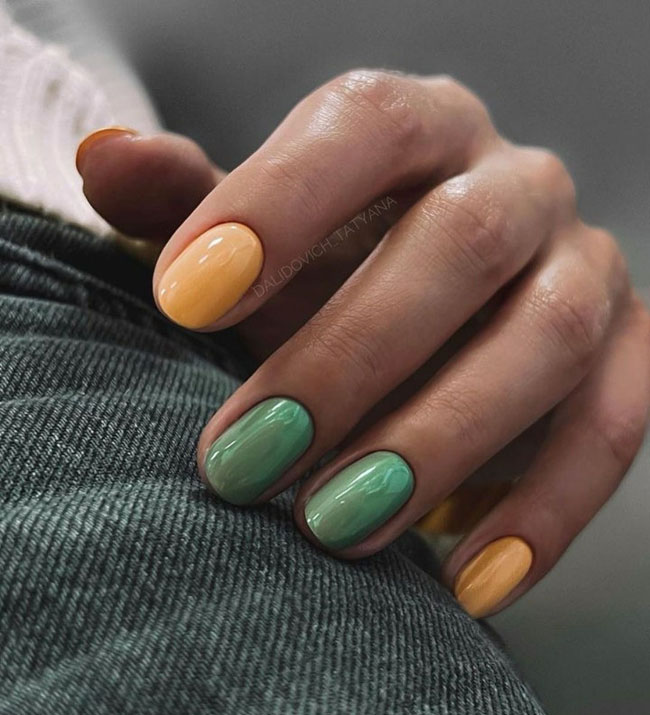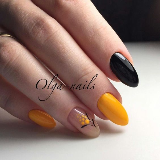 В отличие от летнего дизайна ногтей, в котором присутствует обилие ярких и насыщенных тонов, осеннему характерно использование более приглушенных и насыщенных оттенков. Осень – пора года, в которой происходит увядание природы и сгущение красок. Поэтому для создания осеннего маникюра можете смело выбирать такие цвета как коричневый, графитный, оливковый, горчичный, фисташковый, бордовый, винный, марсала. Также не стоит игнорировать различные оттенки оранжевого, желтого, красного.