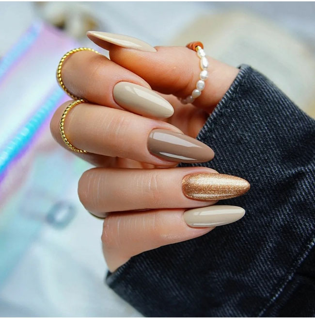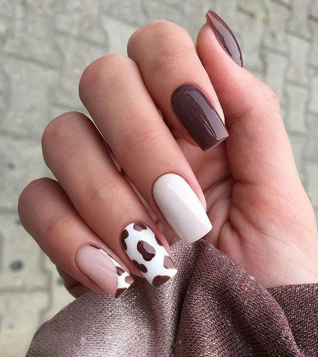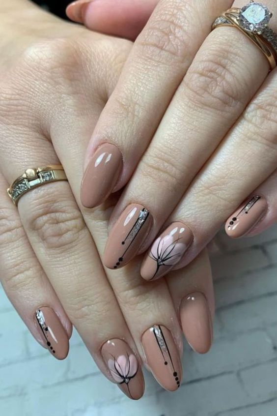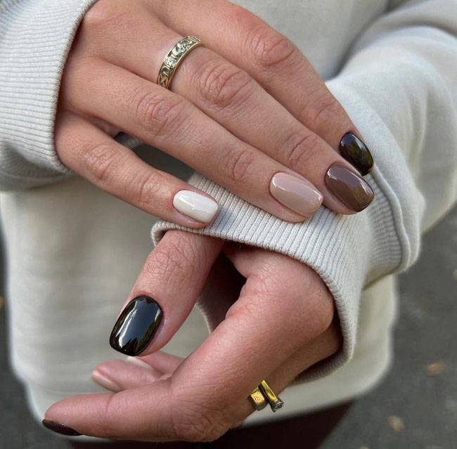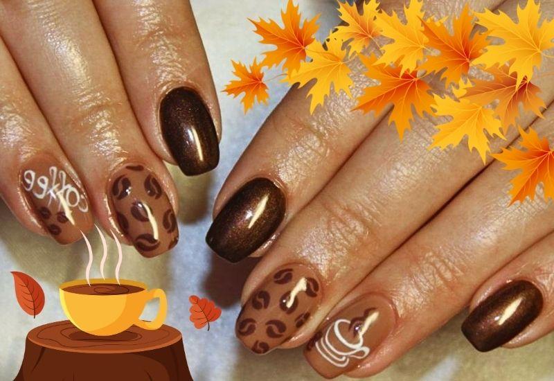 На фото маникюра осени 2024 всегда особую нишу занимают коричневые тона. В этом сезоне предлагается сделать ставку на уютные кофейные расцветки. Это идеальное решение для повседневного или выходного образа. Кофе великолепно сочетается с молоком не только в гастрономии, но и дизайне. Вообще это идеальный фон для практически любых композиций.