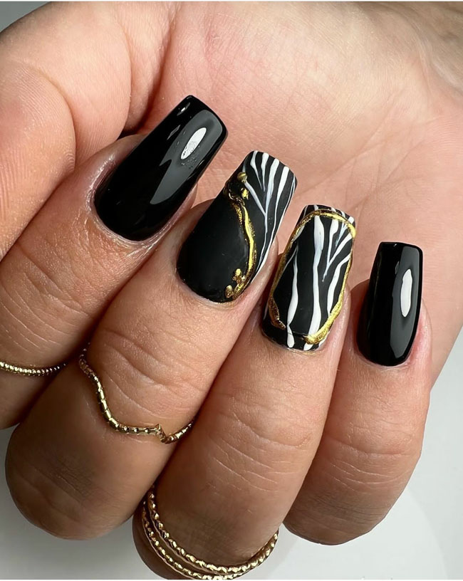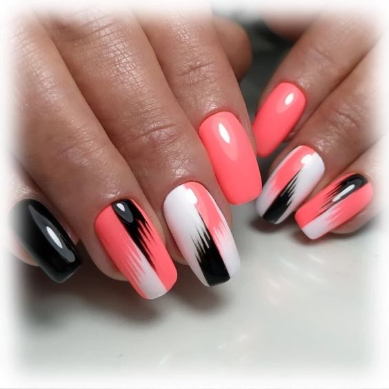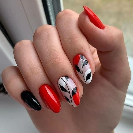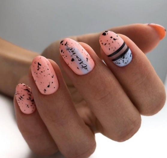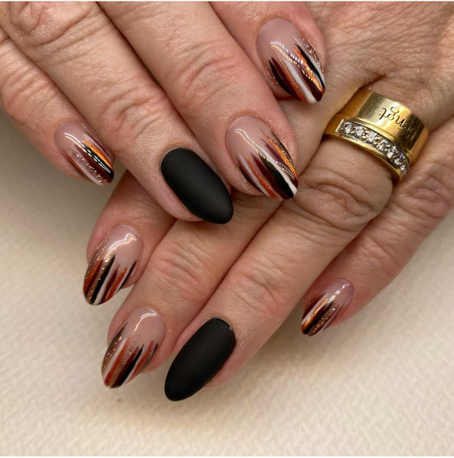 Мастера маникюра изобрели оригинальный абстрактный рисунок – мазки кистью, который стал востребован и осенью 2023 года. Элегантность создаст черно-белая гамма. Более эффектно и оригинально выглядит разноцветный ансамбль из золотого, красного, синего и коричневого оттенков. Креативности остается простор.