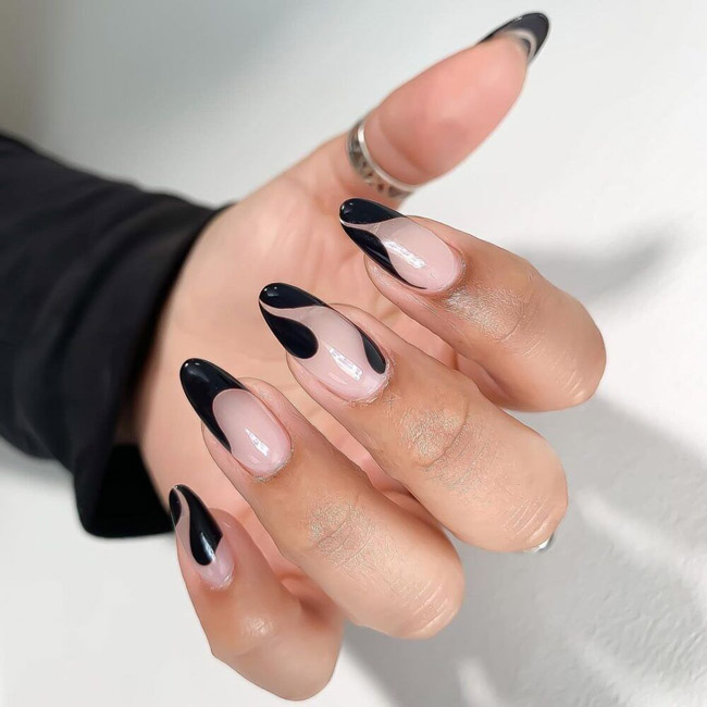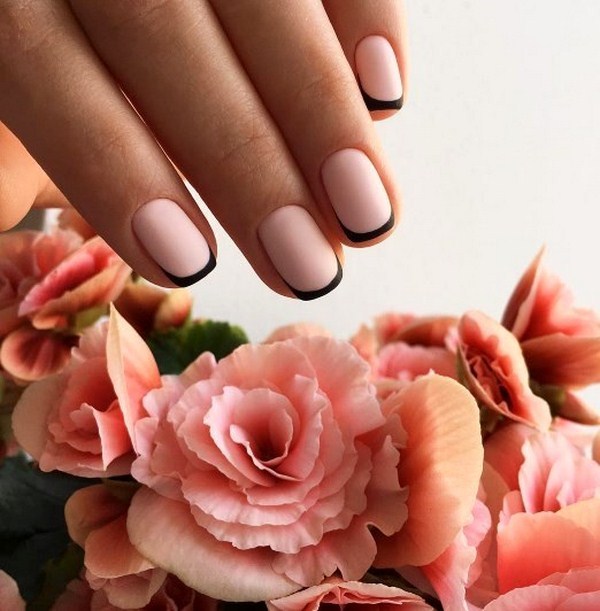 В осенний сезон 2023 актуально делать матовым французский маникюр, разбавлять его принтами и декором, а также акцентировать внимание на безымянный палец или вообще использовать черный цвет