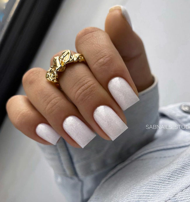Маникюр в стиле нюд – отличное решение для данной длины ногтей. Бежевый, белый, молочный, серый, нежно-розовый, фиалковый – все эти оттенки прекрасно передают зимнее настроение. Чтобы разнообразить такое покрытие, можно добавить единичные блестки, это придаст изысканности.