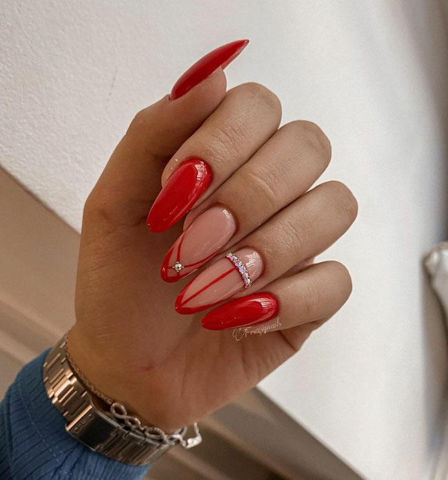Тандем из небольших камней и сверкания страз на ногтях освежит любое естественное покрытие. Главное избегать чрезмерного блеска, который достигает продуманным размещением блестяшек.