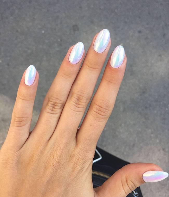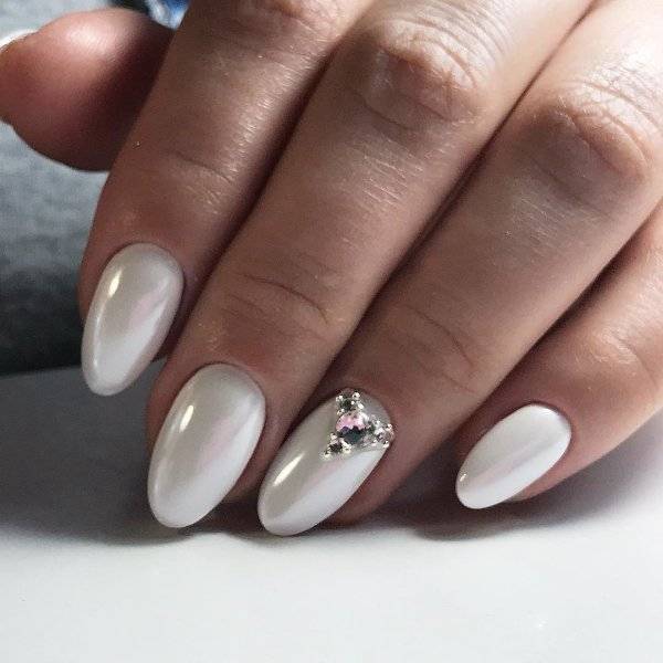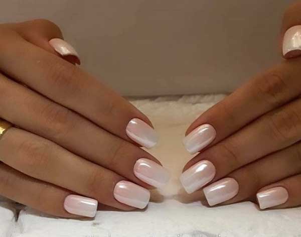Осенью кожа еще сохраняет загар, который очень красиво сочетается с жемчужным покрытием на ногтях. Легкий и светлый оттенок сыплет зеркальными бликами и привлекает взоры. Для создания подобного эффекта используют кремовые оттенки гель-лака с нанесением блеска в виде мелкой втирки. Последняя позволит воссоздать переливы нежного перламутра. В качестве базового тона рекомендовано использовать:
