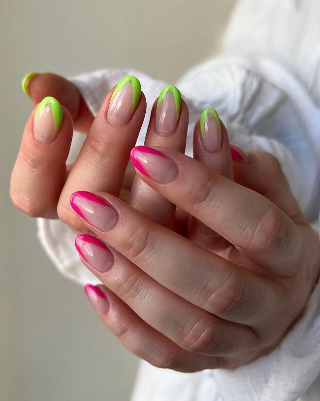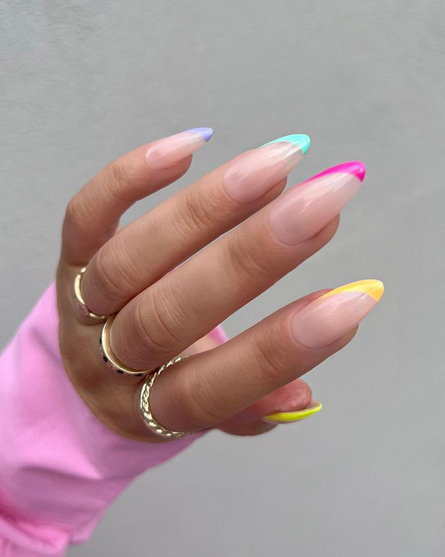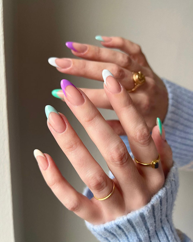 Яркие, цветные кончики — главный тренд прошедшего года и он продлится в этом. Классический белый кончик сменяется модными оттенками 2024 года — красным, синим, зеленым.
