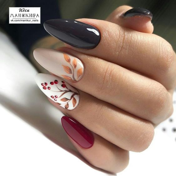 По-осеннему красиво смотрятся рисунки рябины на ноготках. Кроме того, этот дизайн очень хорошо сочетается с разноцветными ноготками в тон рисунка. Например, бордовые — в цвет ягод, и оранжевые — в цвет осенних увядающих листиков.