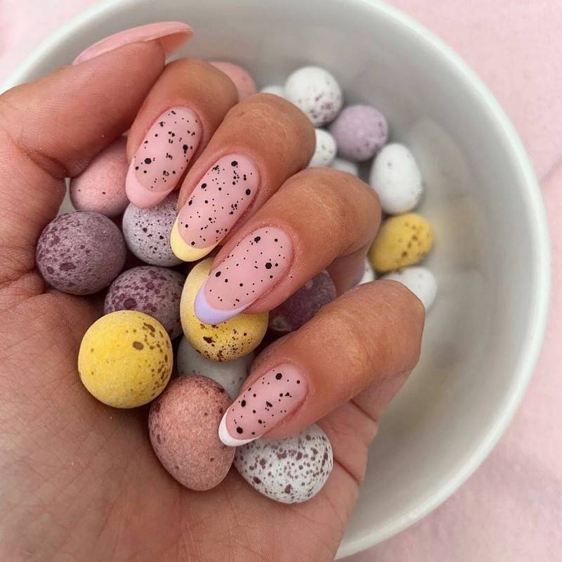 Сочетание нейла-арта в стиле паутинка с эффектом перепелиных яиц. Приятные нотки нюдовых тонов получают элегантный акцент паутинки на одних пальчиках и оригинальный эффект перепелиного яйца на других. Иногда уместно использовать стразы. Вариант нейл-арта уместен в любой ситуации.