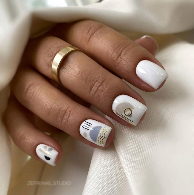 Поклонницам спокойных легких композиций стоит обратиться к классическому молочному. Он мягче и теплее белоснежного, абсолютно универсален, вариативен в плане сочетаний. Молочный используют как фон для геометрических или выразительных ансамблей или самостоятельно.