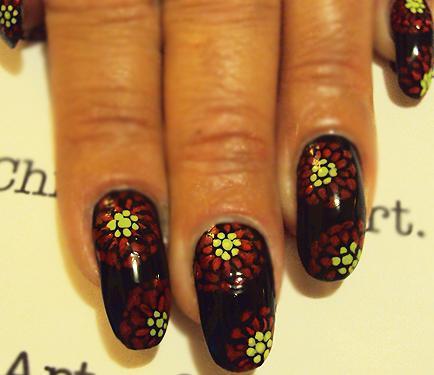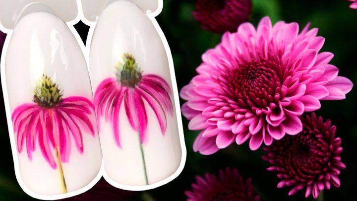 Хризантема существует в огромных видах расцветки, что дает возможность выбрать подходящий под ваши вкусы цвет. Она рисуется достаточно просто при помощи акриловых красок, лака, либо выкладывается стразами. Для праздничного варианта маникюра цветок украшают стразами, блестками или камифубуками. Уникальным и роскошным дизайном станет 3D лепка хризантемы, выполненная из акриловой пудры нежной расцветки.